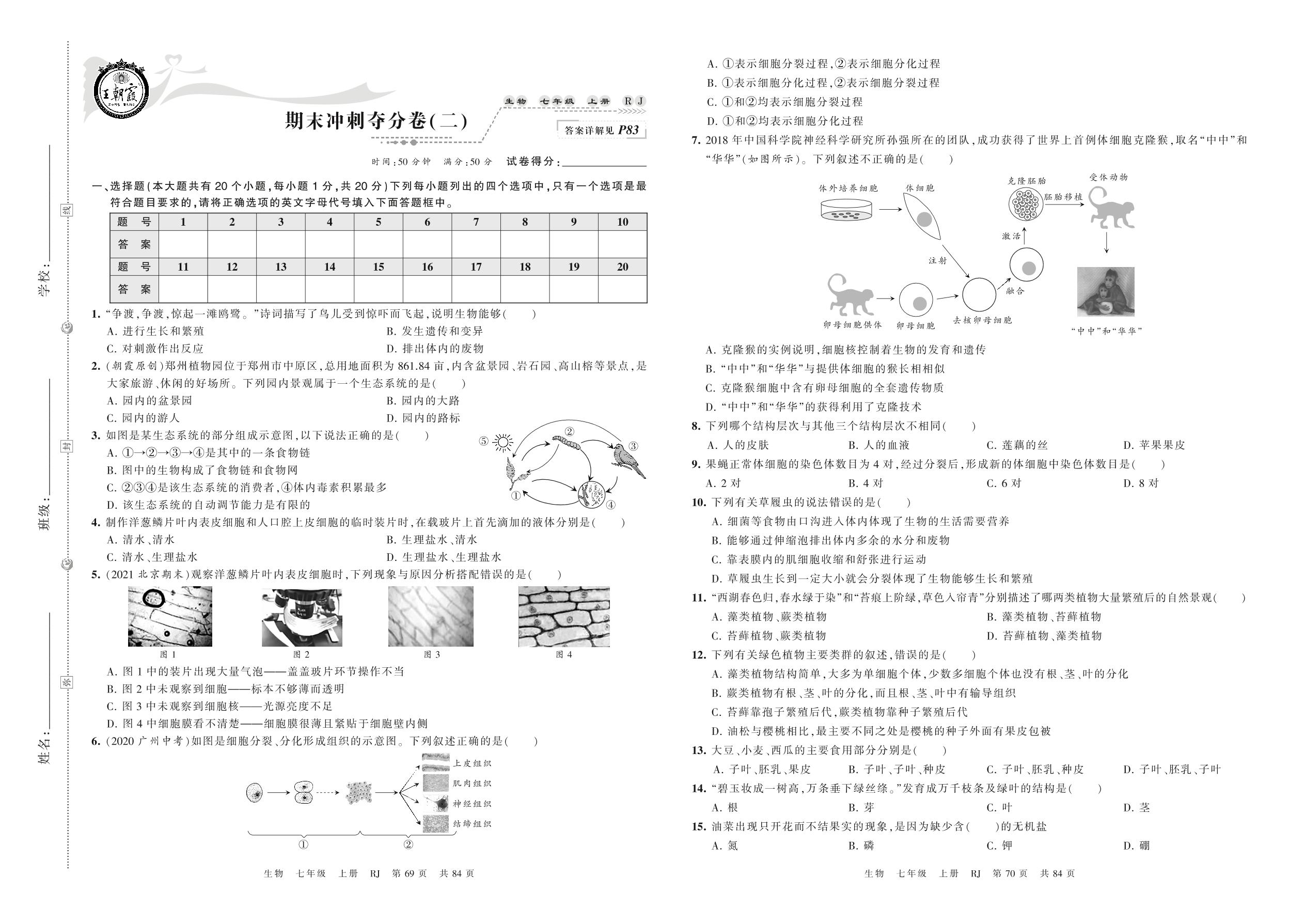 2021上册七年级生物人教版 期末冲刺夺分卷(二)
