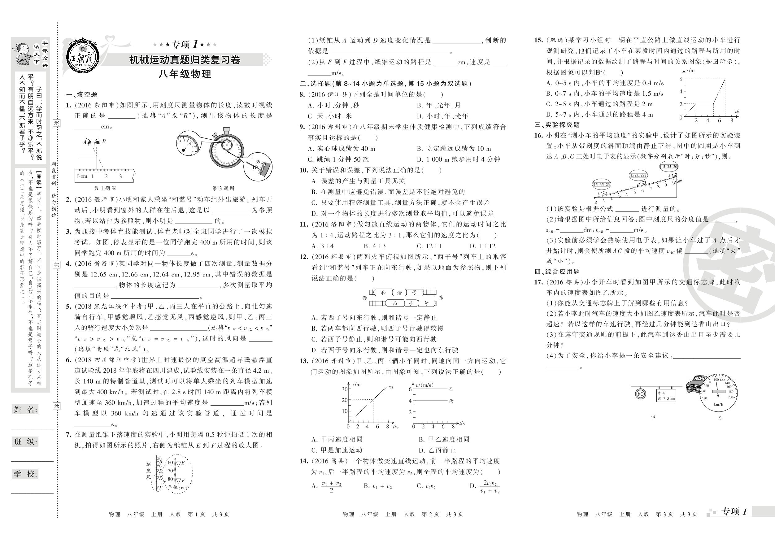 王朝霞期末专项卷——机械运动、声现象真题归类复习卷八年级上册物理(人教版)