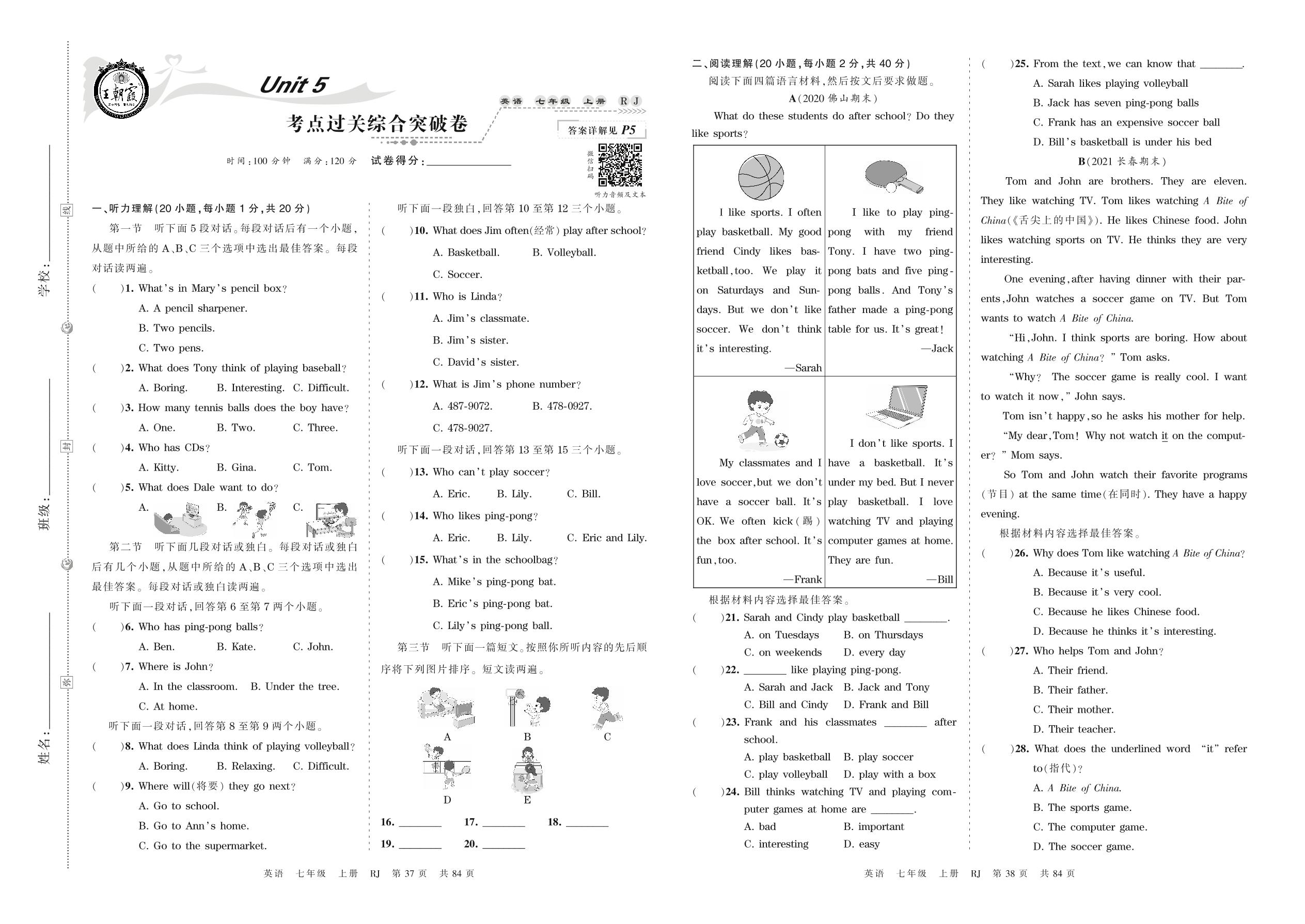 2021上册七年级英语人教版 Unit 5 考点过关综合突破卷_R211231112905584