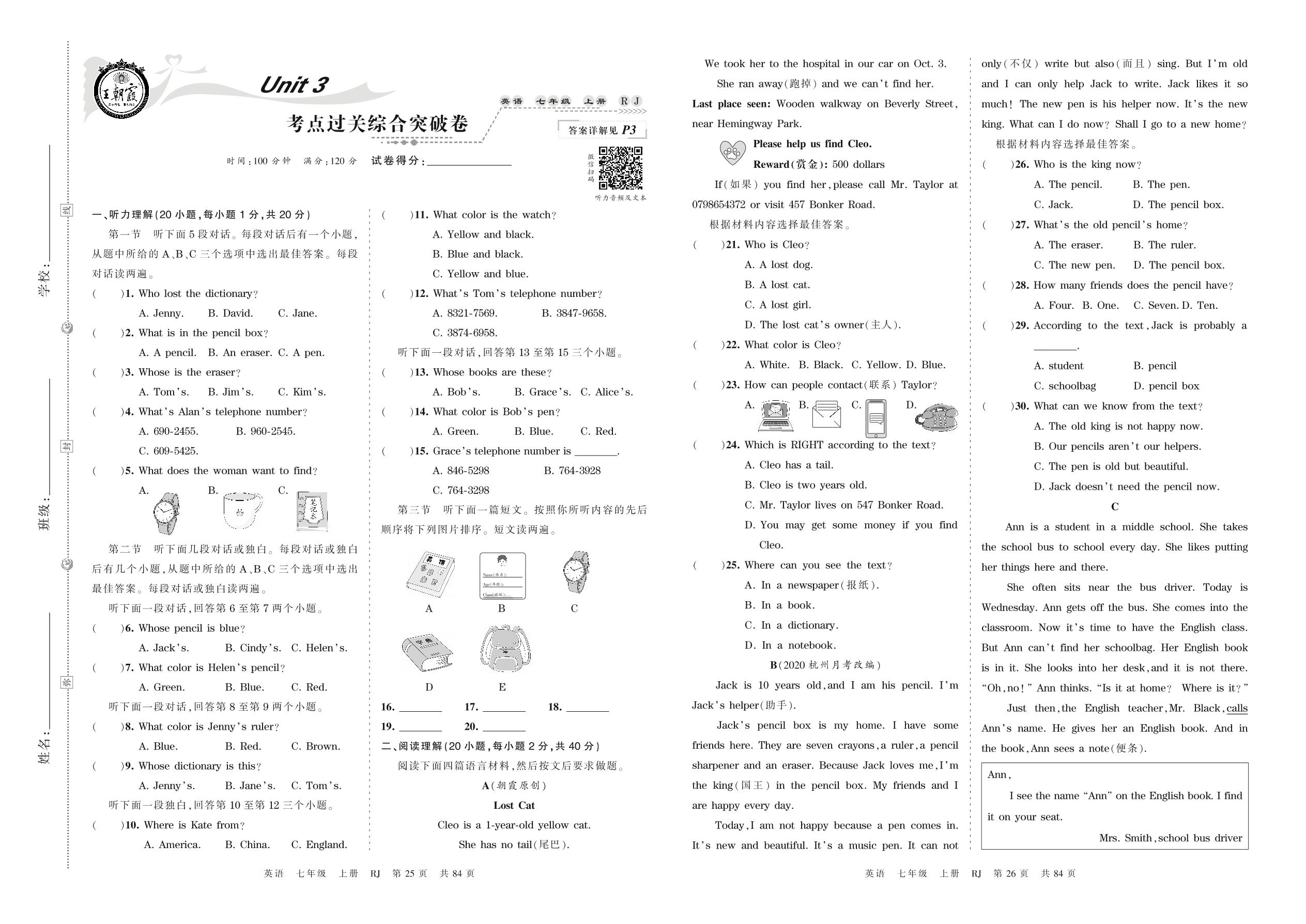 2021上册七年级英语人教版 Unit 3 考点过关综合突破卷_R211231112905247