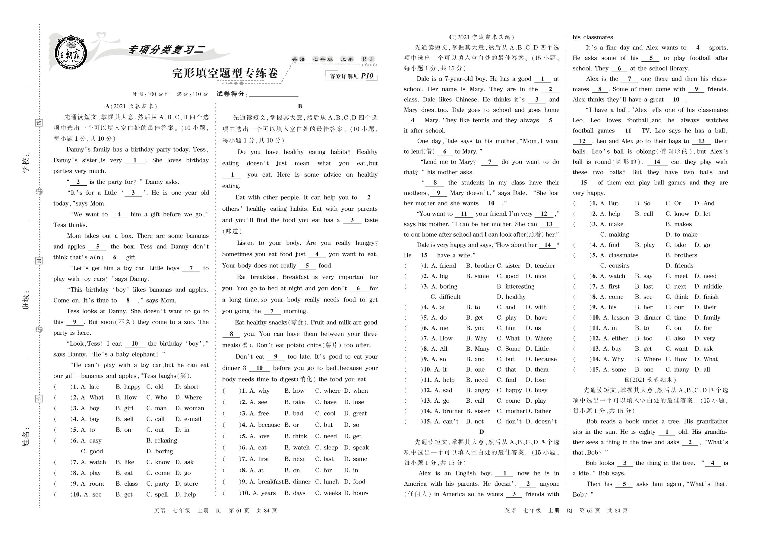 2021上册七年级英语人教版 完形填空题型专练卷_R211231112906433