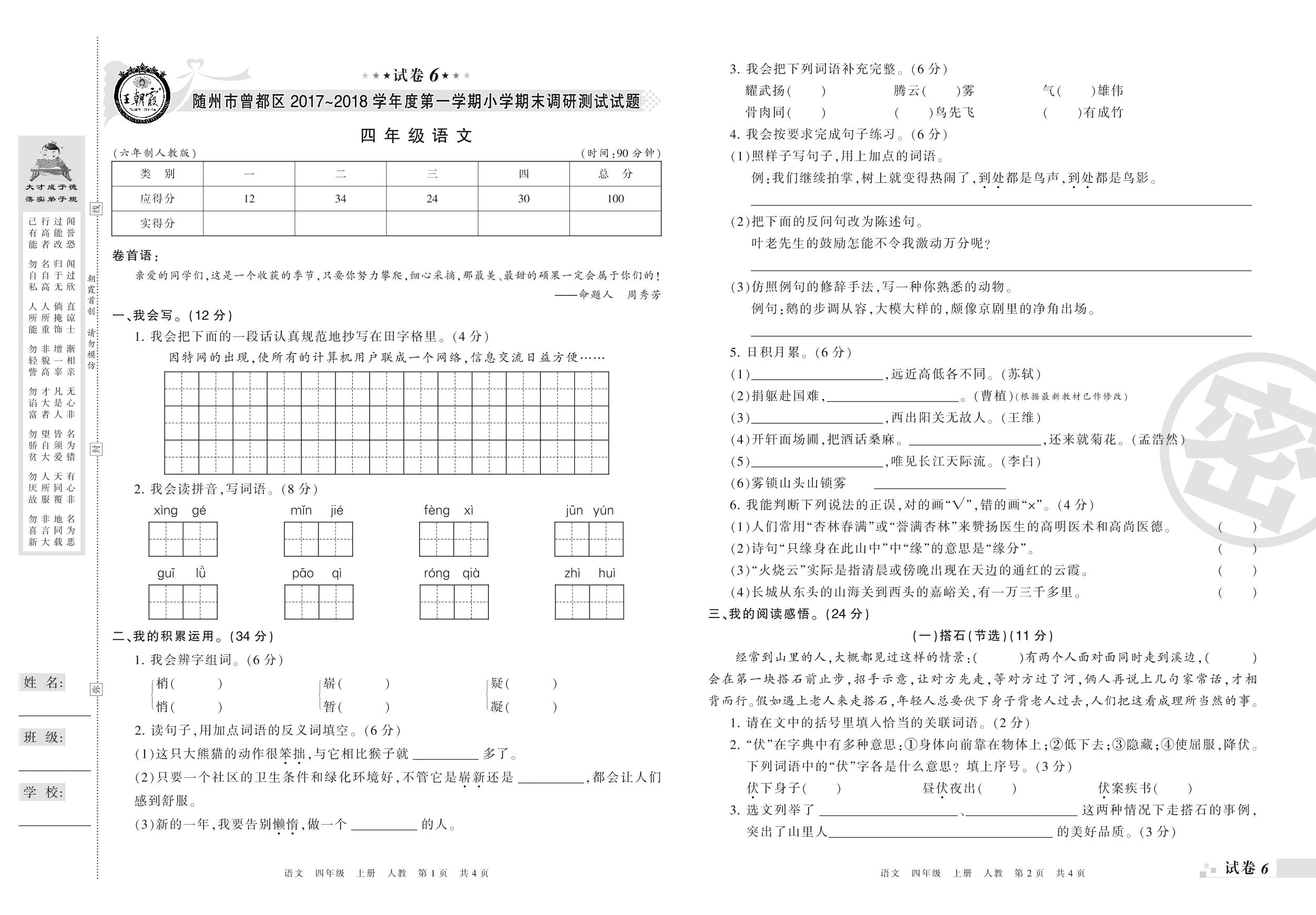 2017-2018学年第一学期随州市曾都区四年级语文试卷(人教版)【6】