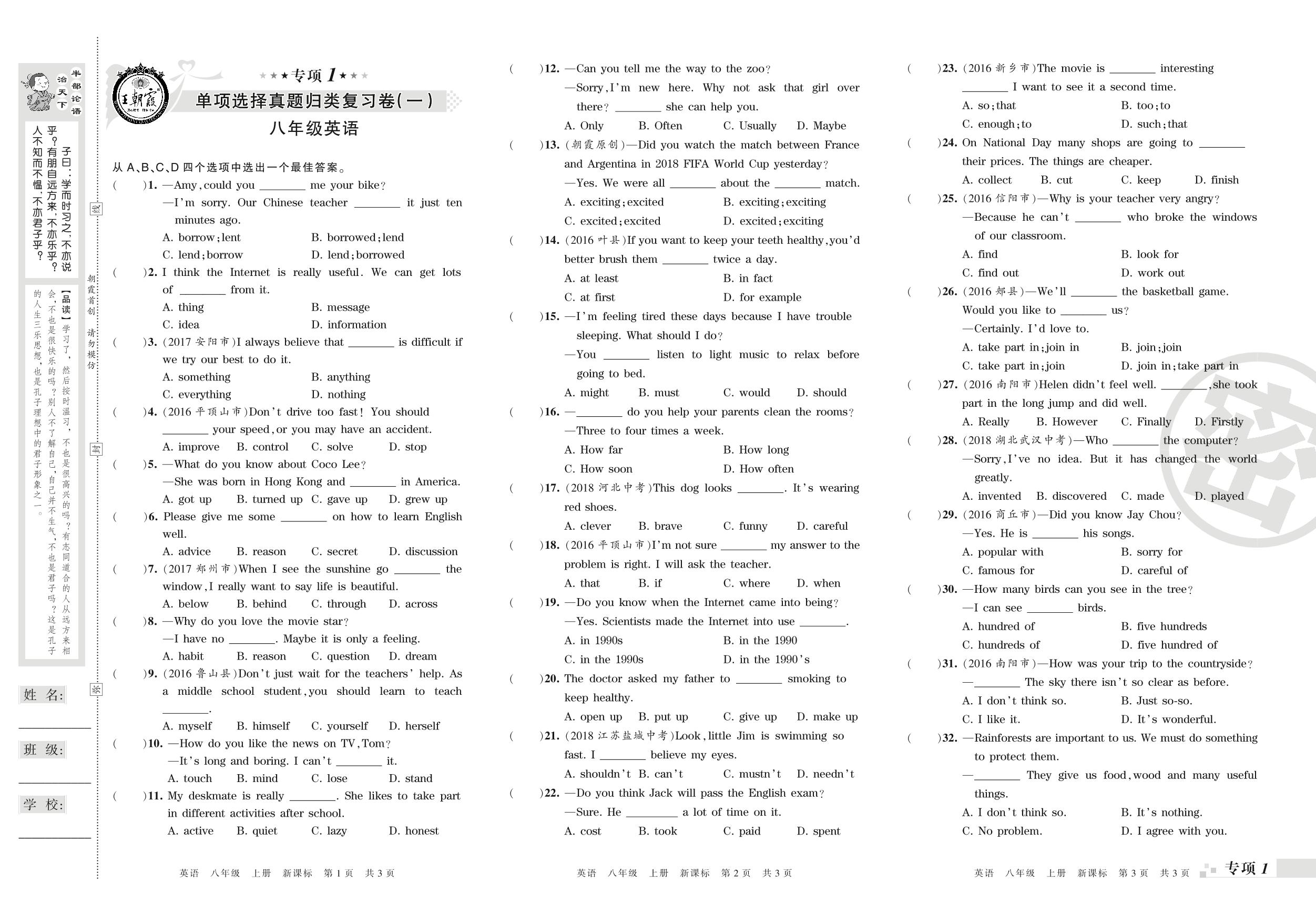 王朝霞期末专项卷——单项选择(一)(二)真题归类复习八年级上册英语(新课版)