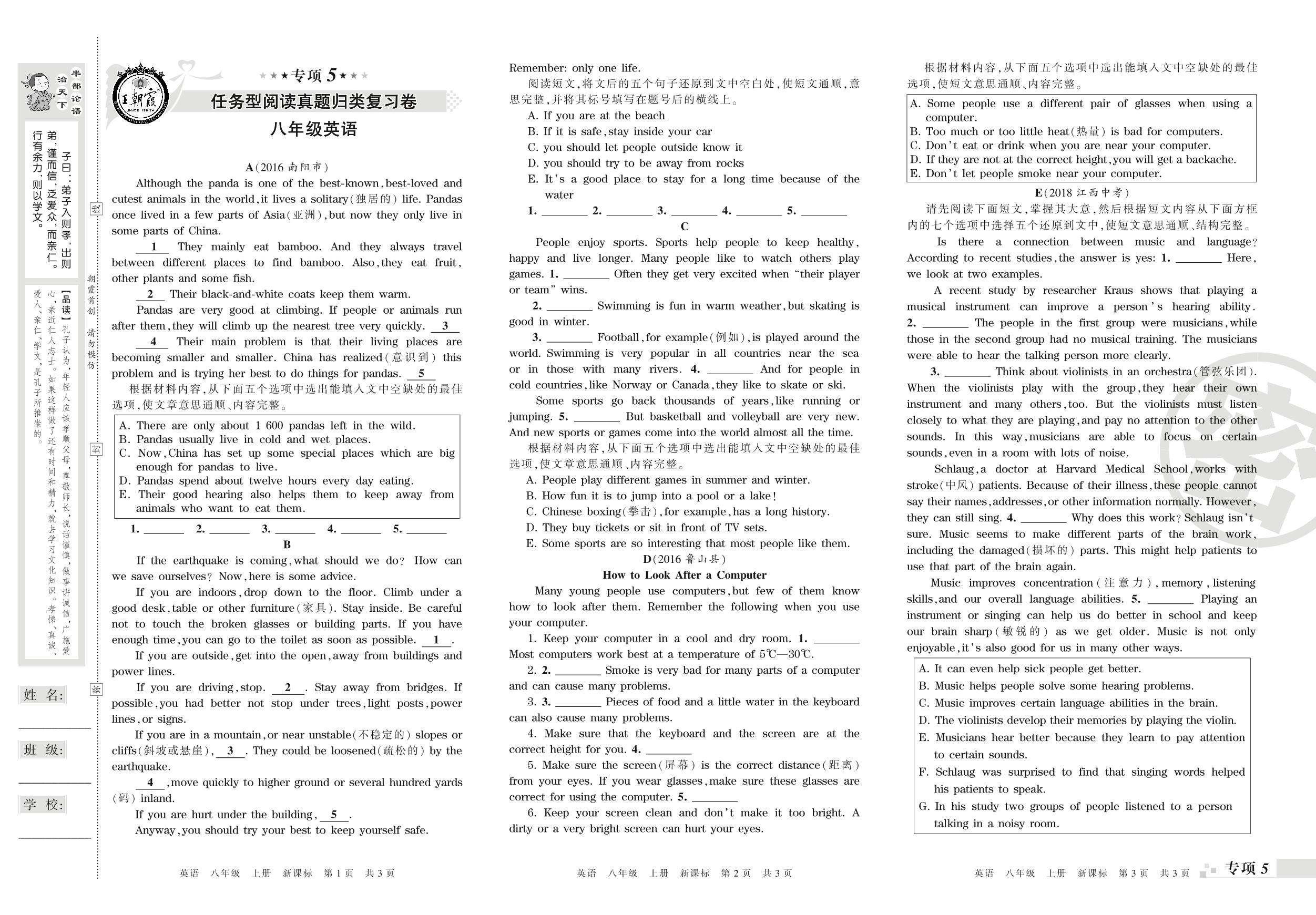 王朝霞期末专项卷——任务型阅读、词语运用真题归类复习八年级上册英语(新课版)