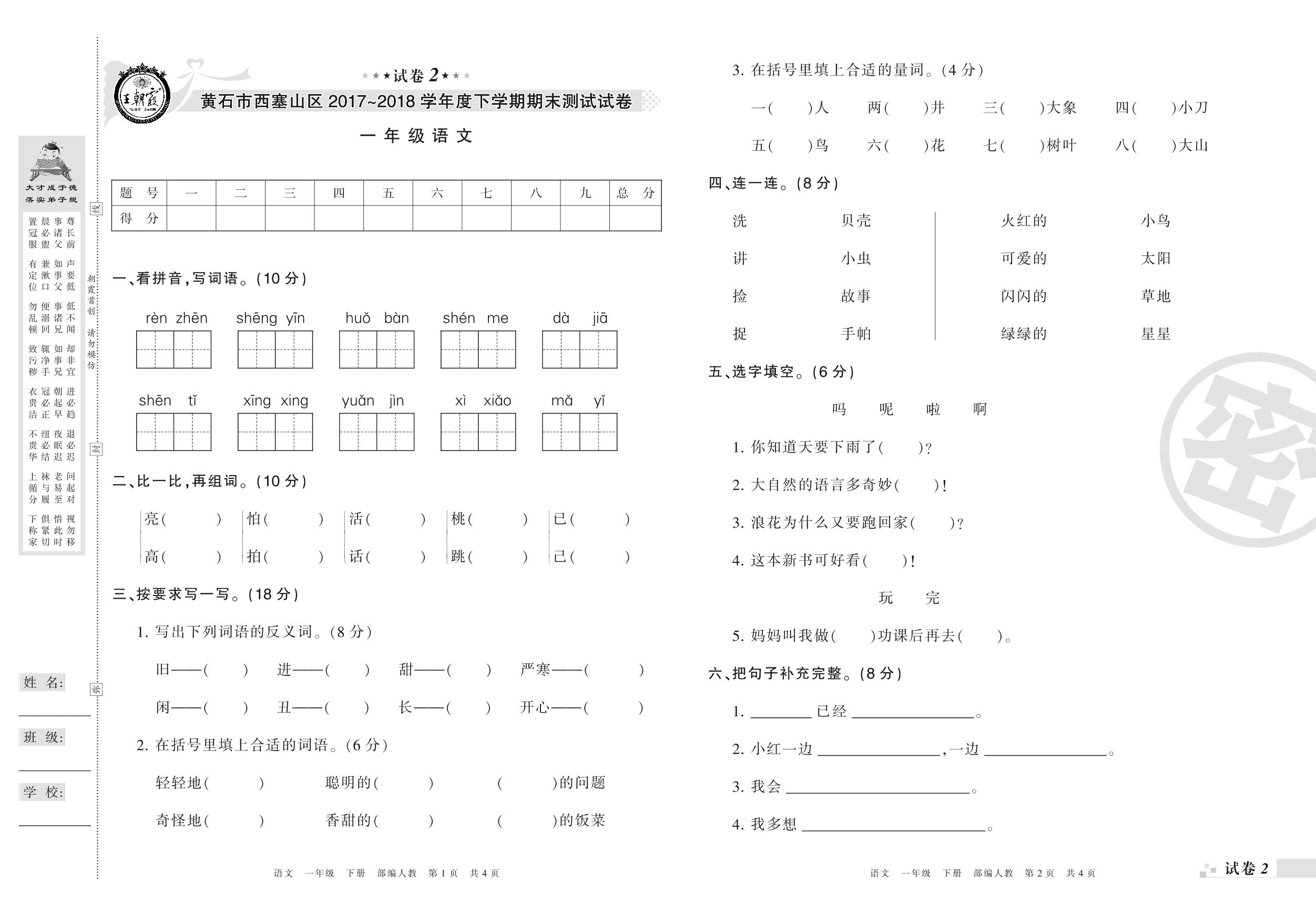 2017-2018学年第二学期黄冈市西塞山区一年级语文试卷(人教版)【2】