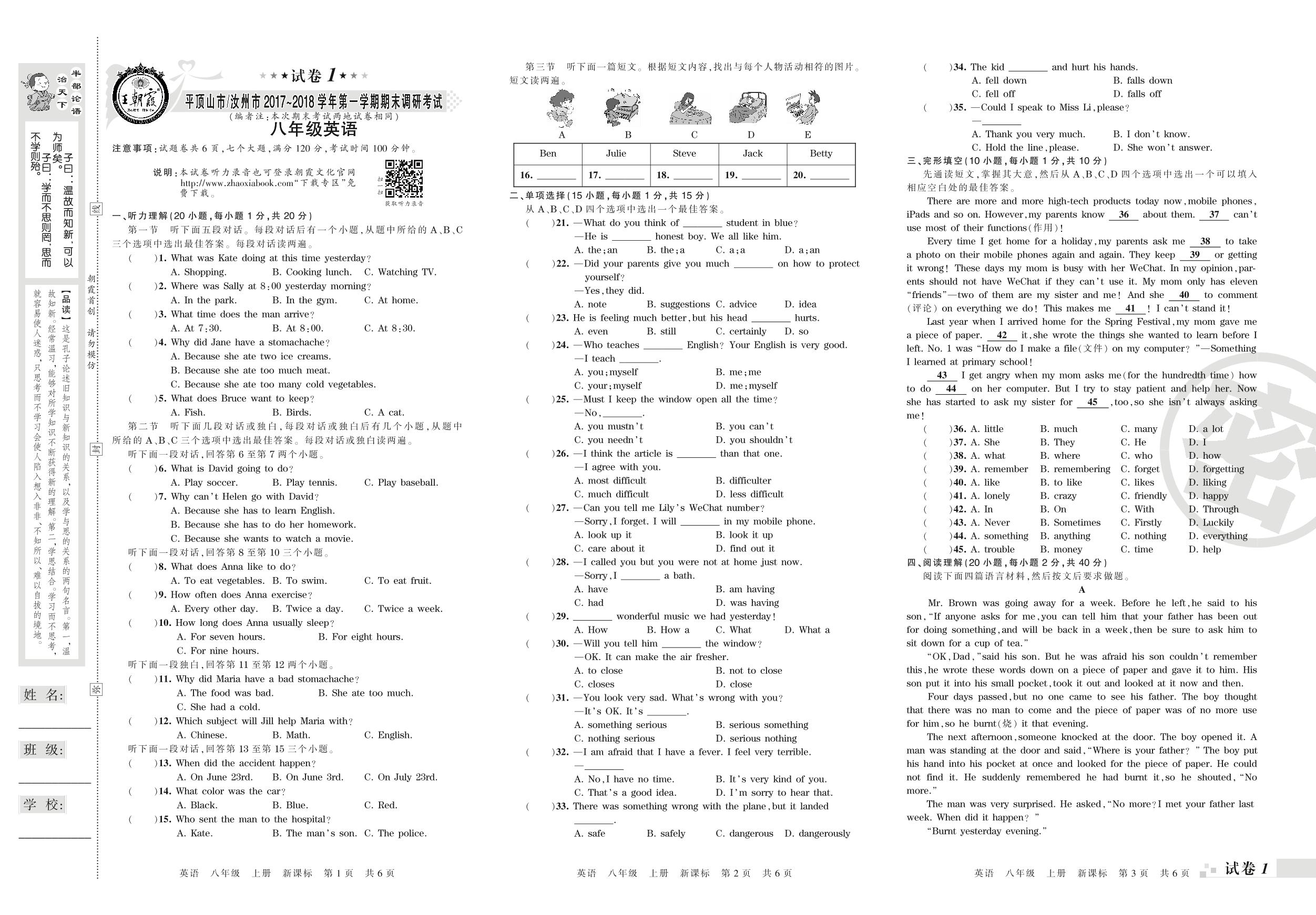 2017-2018学年第一学期平顶山市八年级英语试卷(新课版)