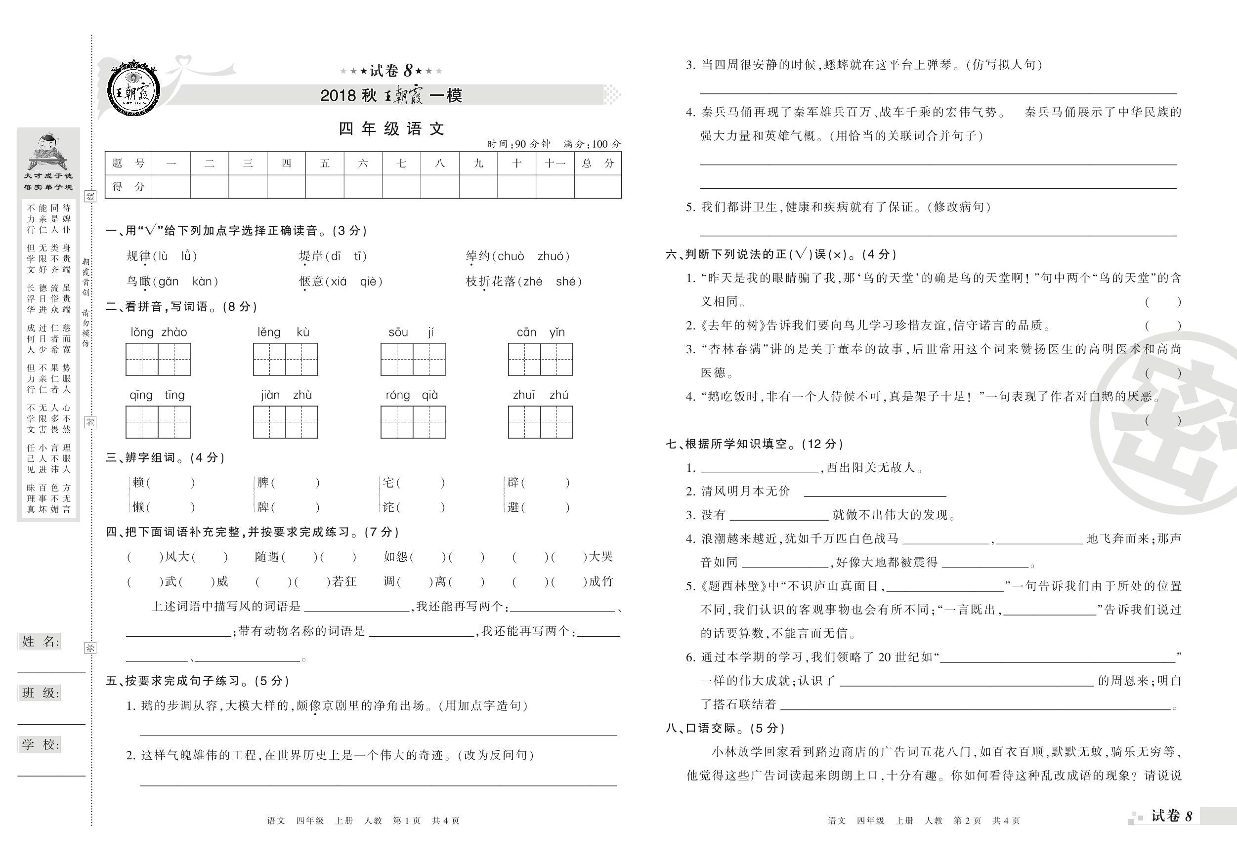 王朝霞期末模拟卷四年级上册语文(人教版)_R210801222255【8】