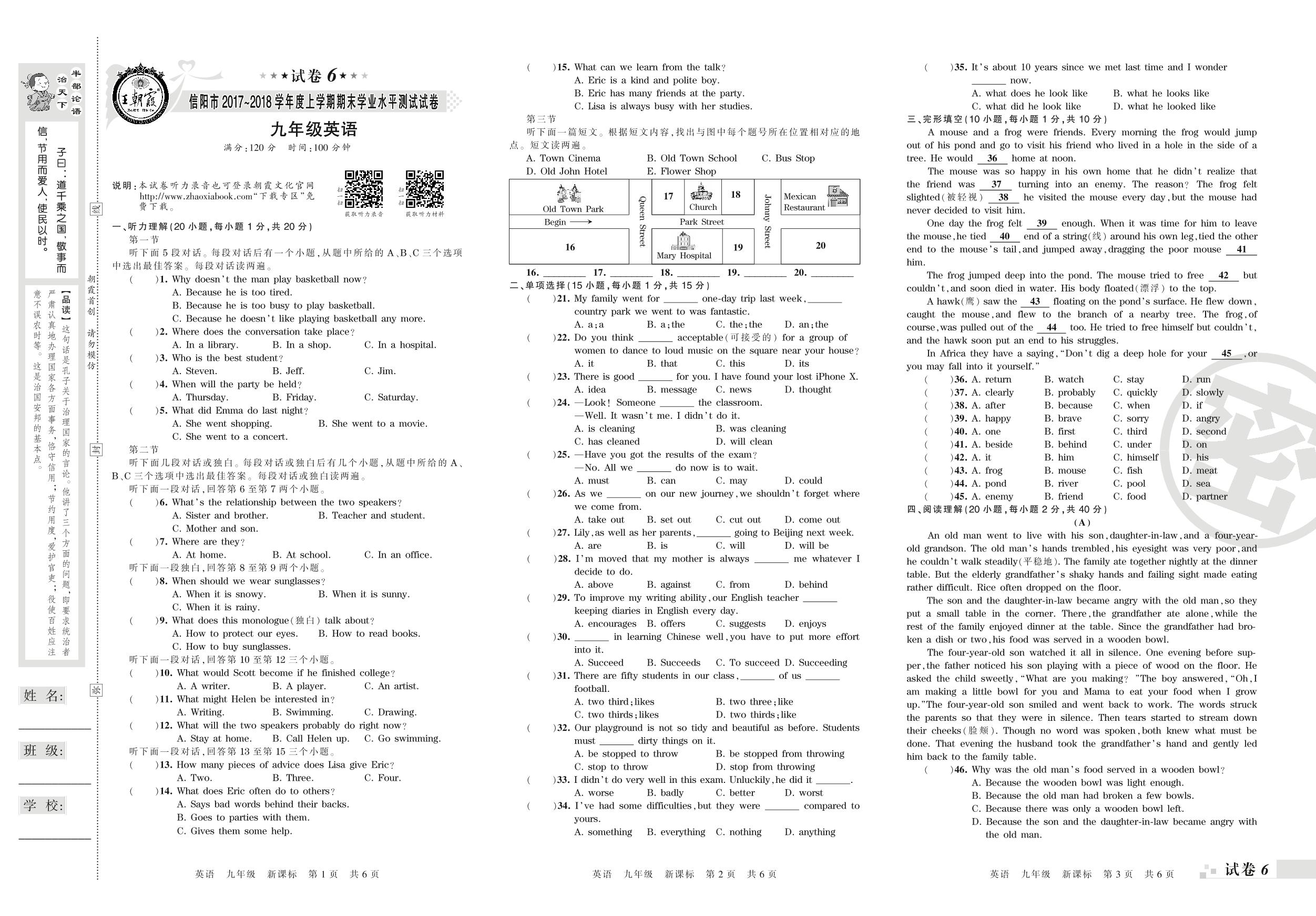 2017-2018学年第一学期信阳市九年级英语试卷(新课版)