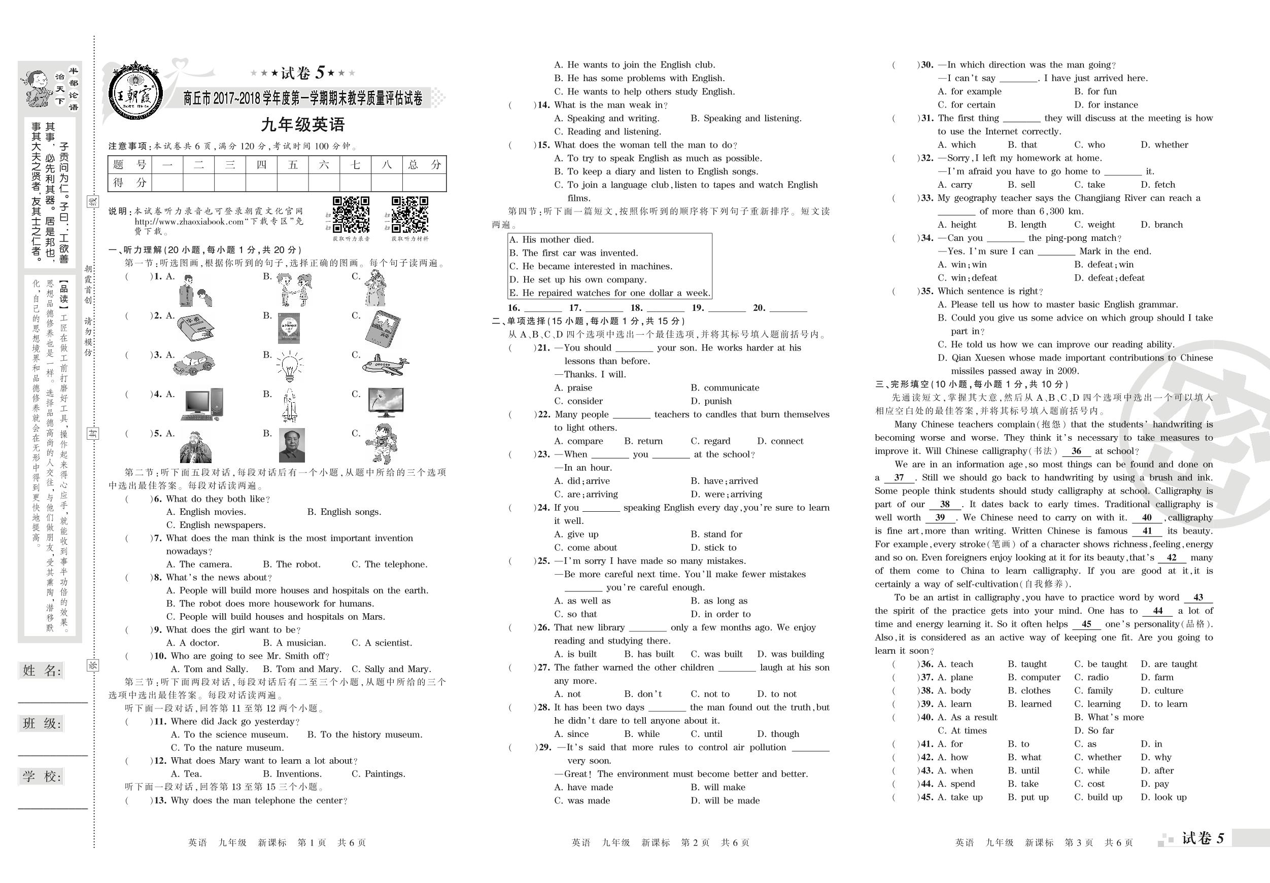 2017-2018学年第一学期商丘市九年级英语试卷(新课版)