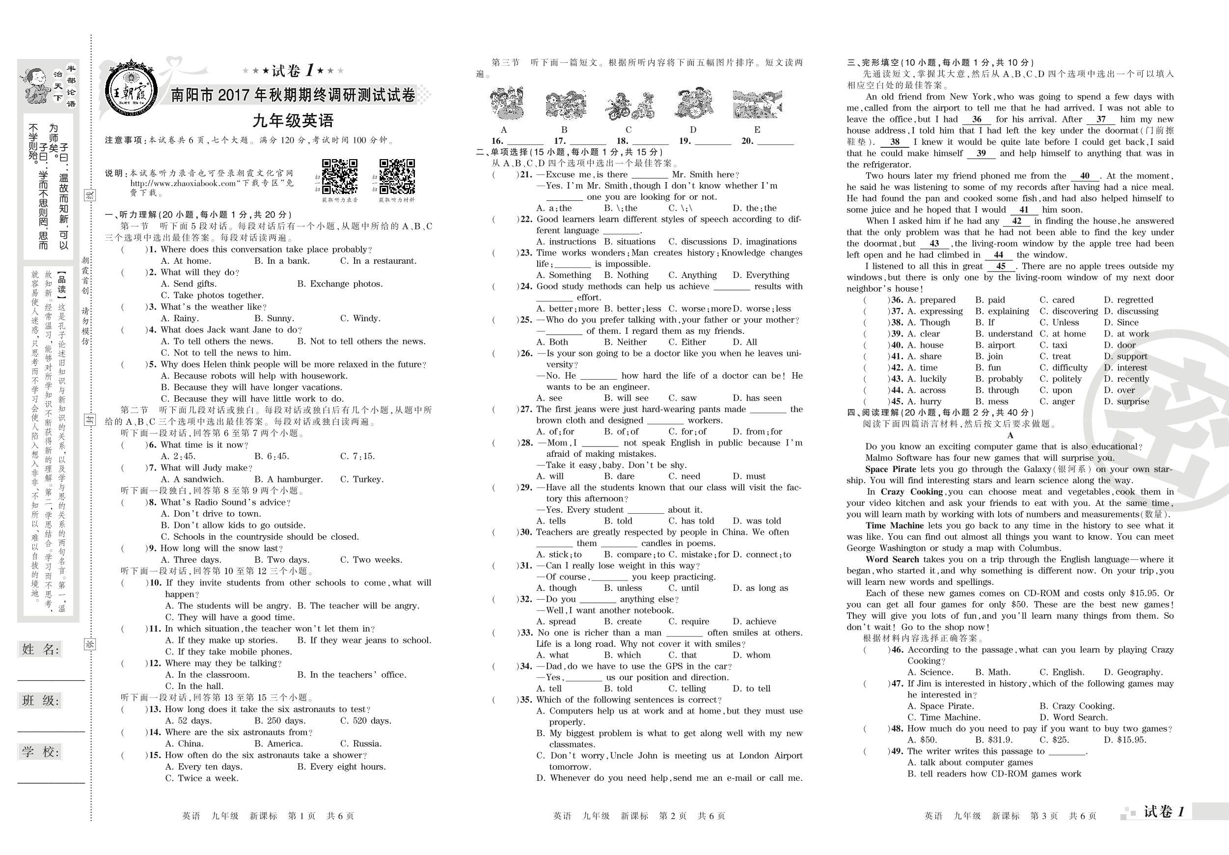 2017-2018学年第一学期南阳市九年级英语试卷(新课版)