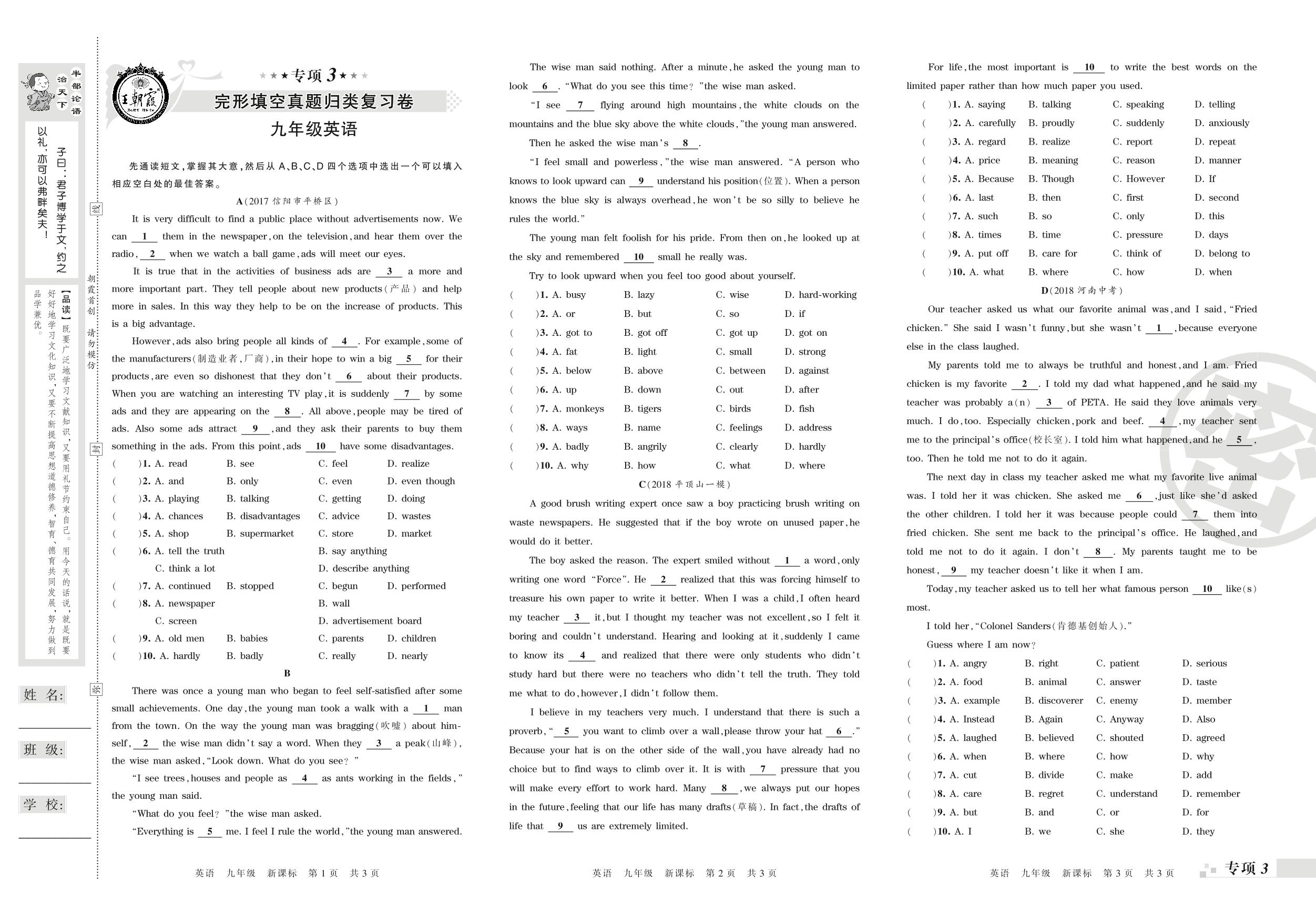 王朝霞期末专项卷——完形填空、选择型阅读真题归类复习九年级上册英语(新课版)