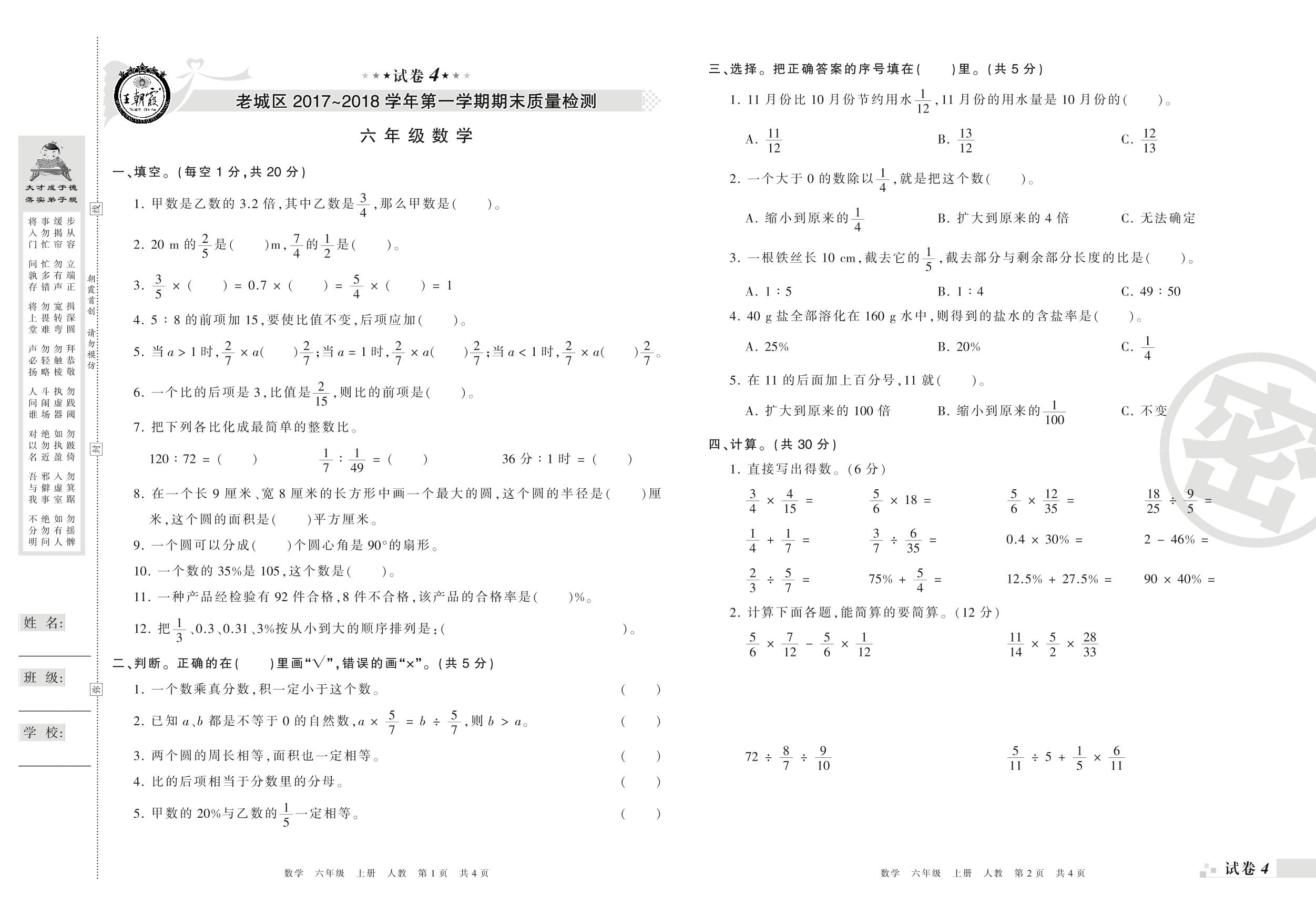 2017-2018学年第一学期洛阳市老城区六年级数学试卷(人教版)【4】