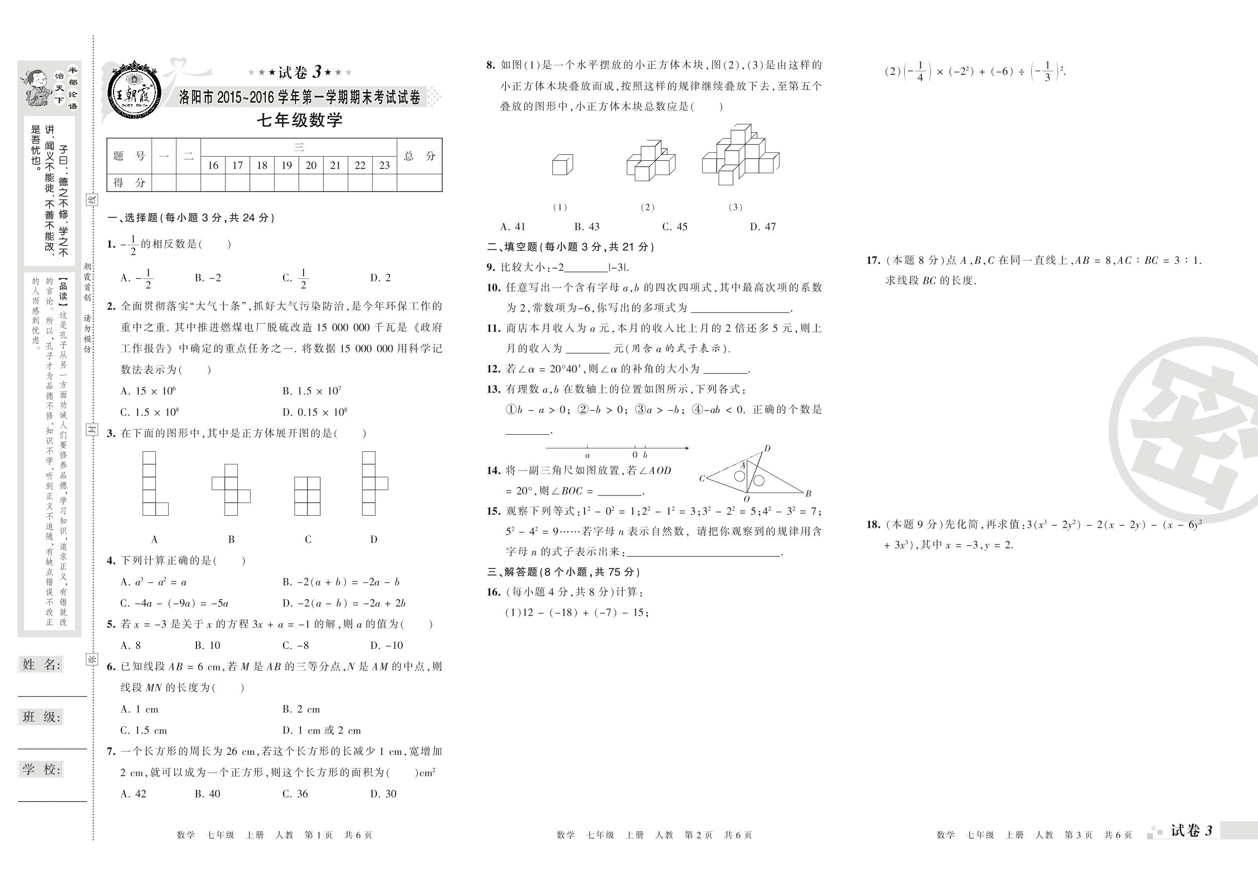 2015-2016学年第一学期洛阳市七年级数学试卷(人教版)【3】