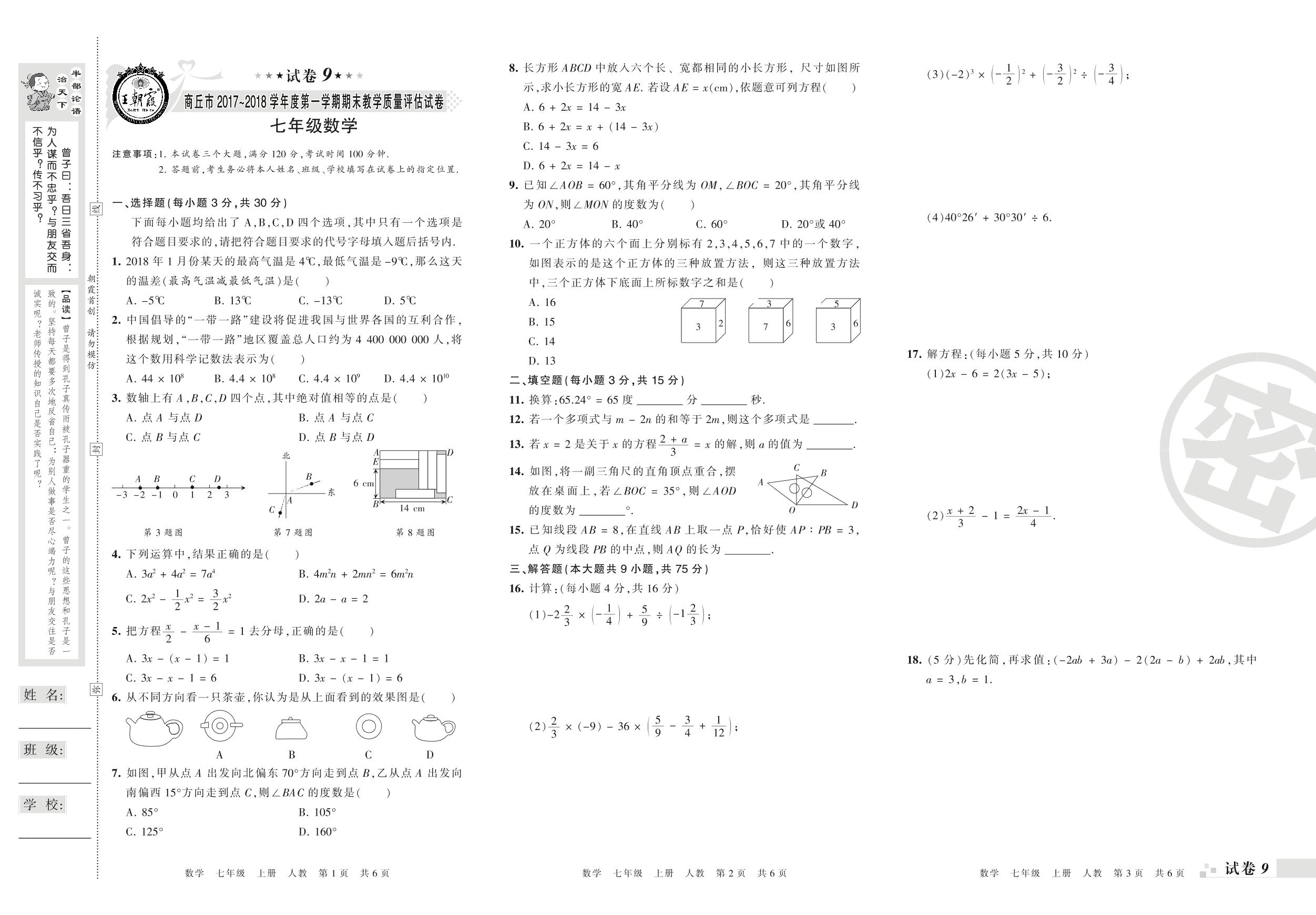 2017-2018学年第一学期商丘市七年级数学试卷(人教版)【9】