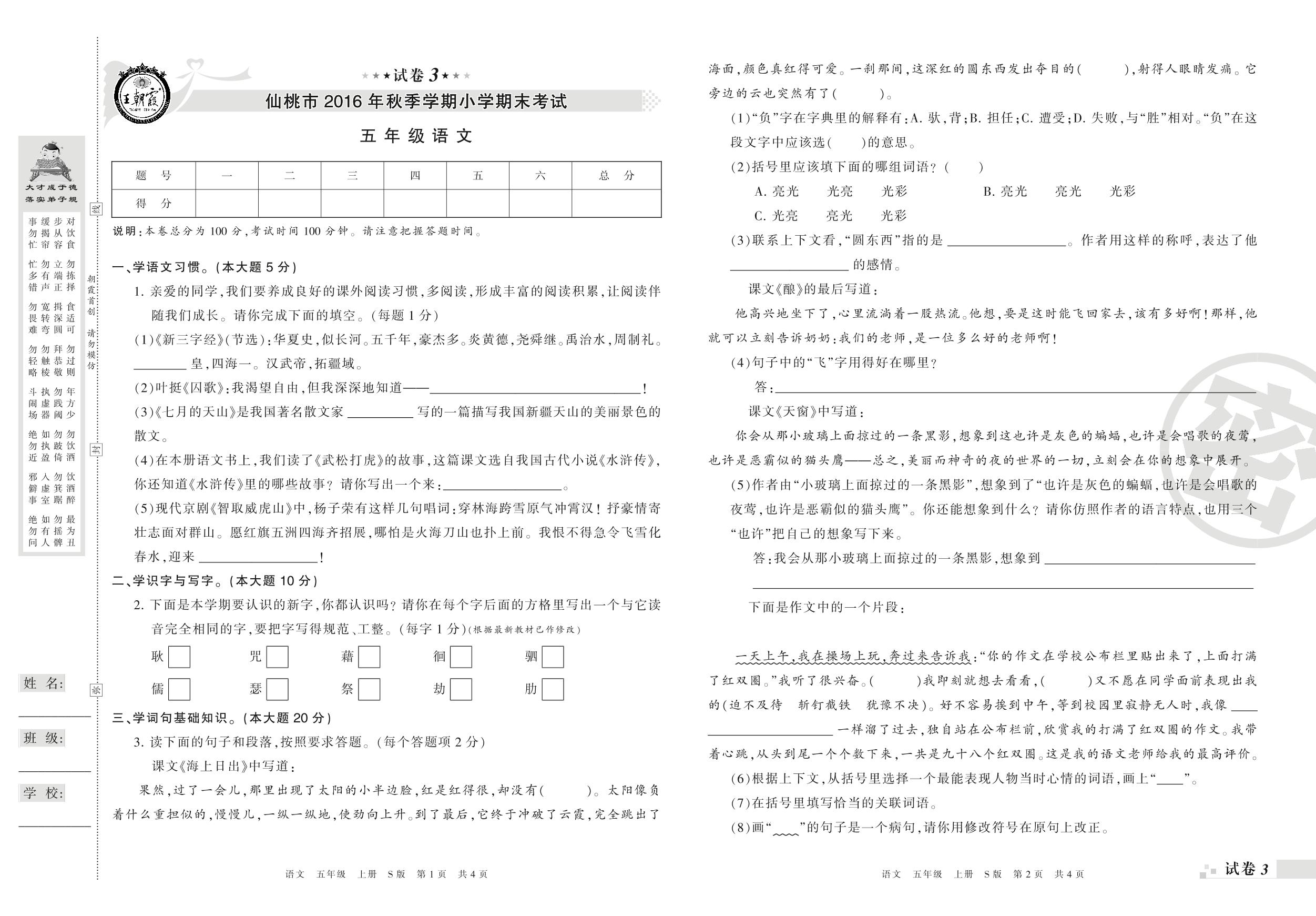 2016-2017学年第一学期仙桃市五年级语文试卷(S版)【3】
