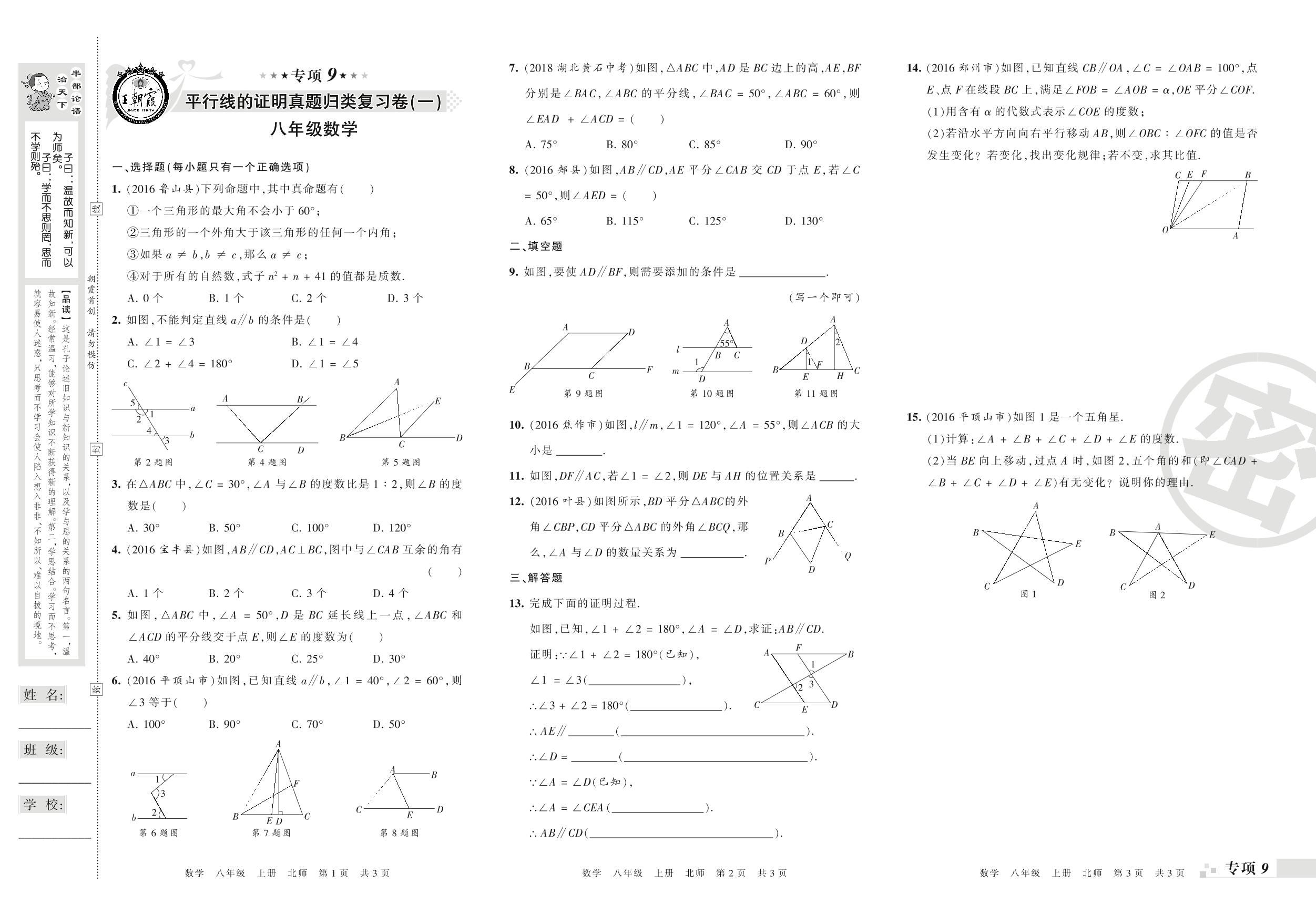 王朝霞期末专项卷——平行线的证明(一)(二)真题归类复习卷八年级上册数学(北师版)【0】