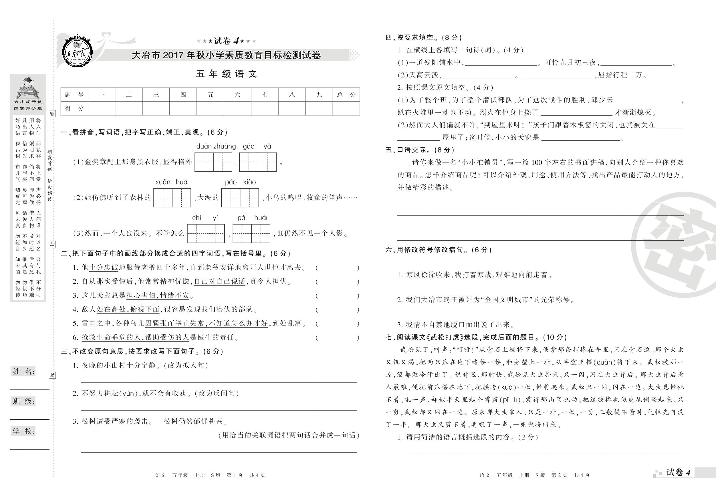 2017-2018学年第一学期大冶市五年级语文试卷(S版)【4】