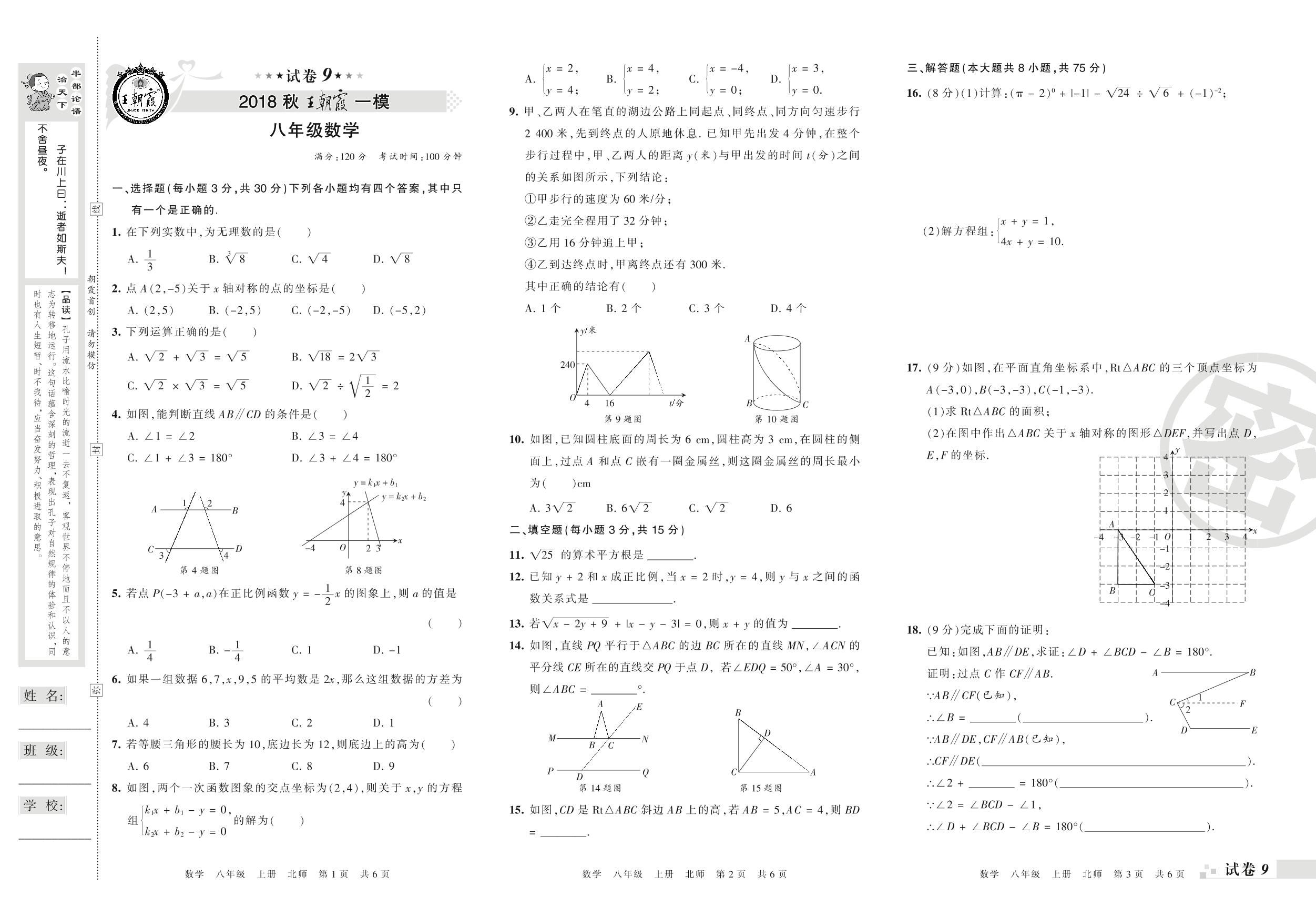 王朝霞期末模拟卷八年级上册数学(北师版)【9】