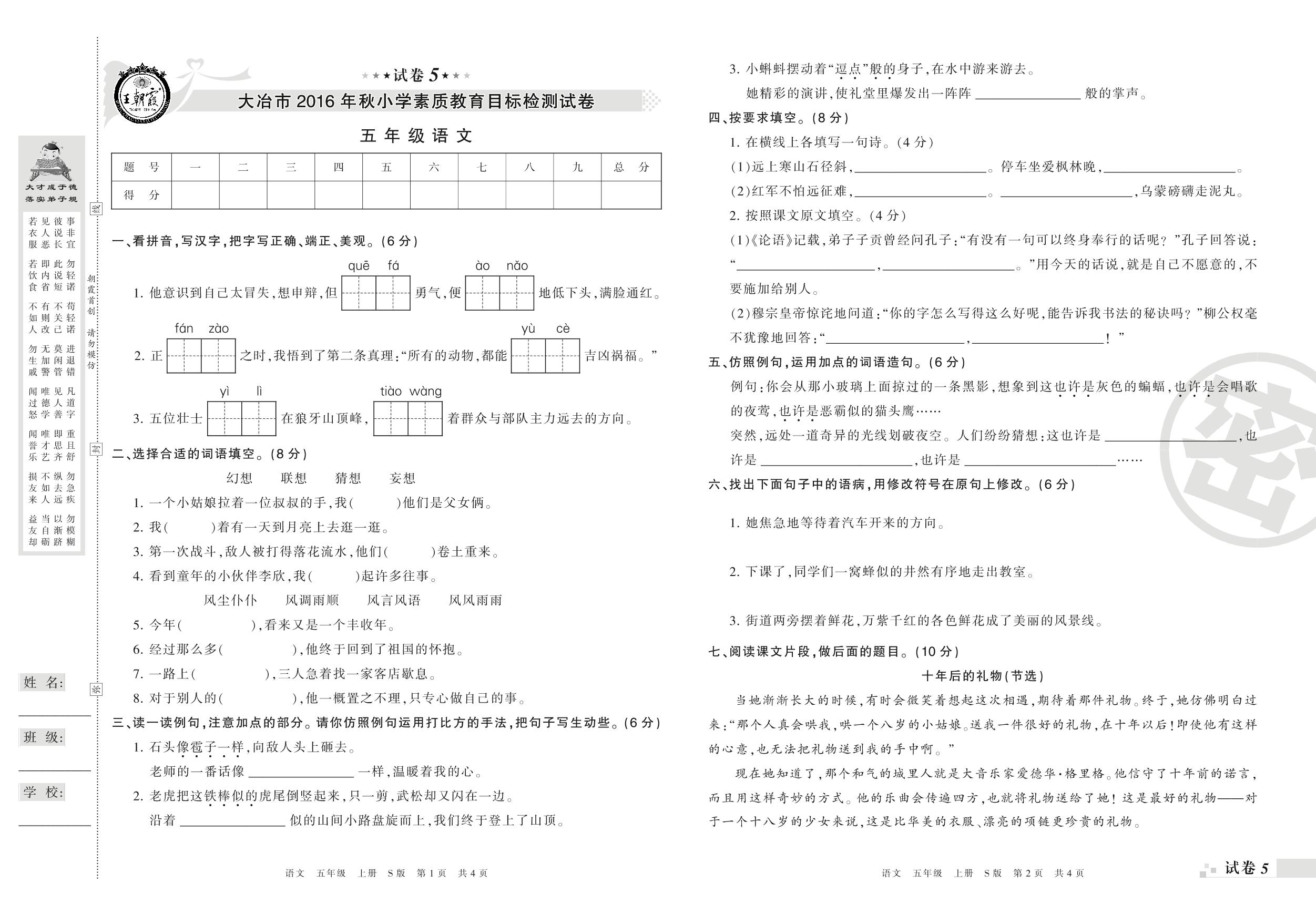 2016-2017学年第一学期大冶市五年级语文试卷(S版)【5】