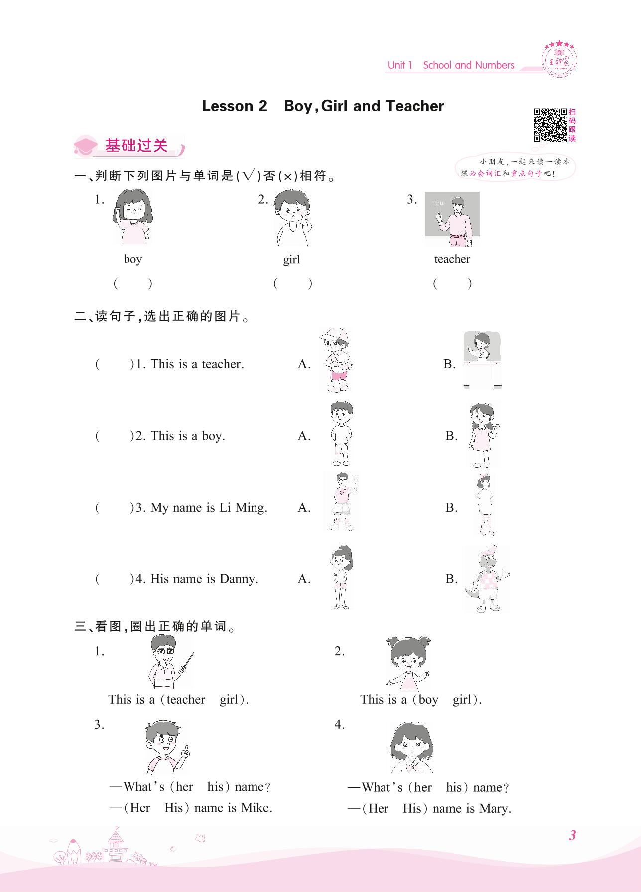 2021上册三年级英语冀教版 Unit 1—Lesson 2 Boy,Girl and Teacher