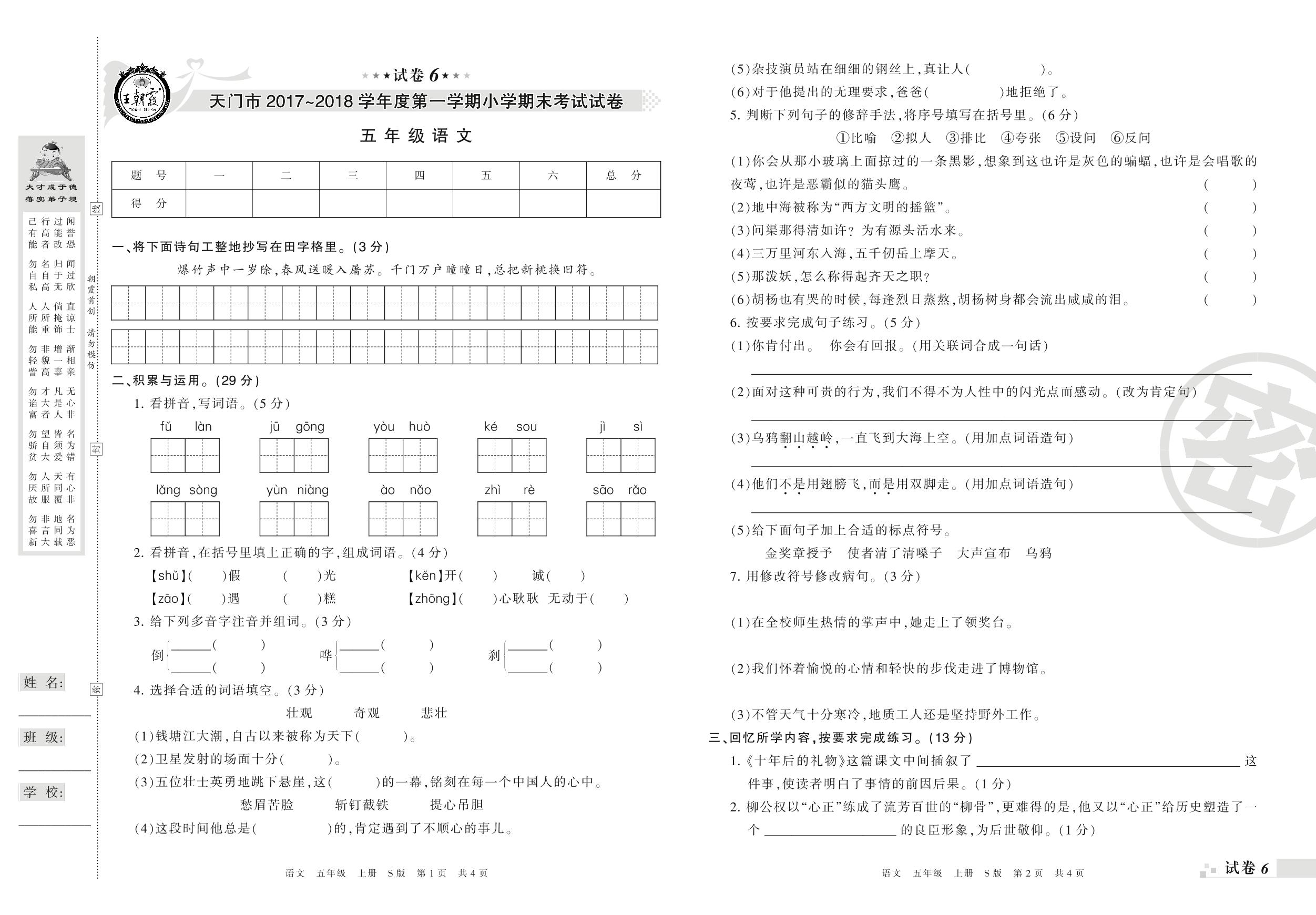 2017-2018学年第一学期天门市五年级语文试卷(S版)【6】
