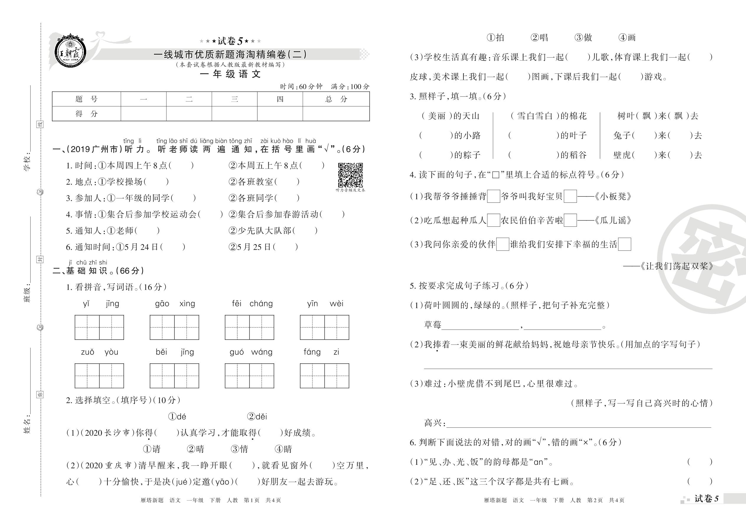一年级语文人教版下册期末卷