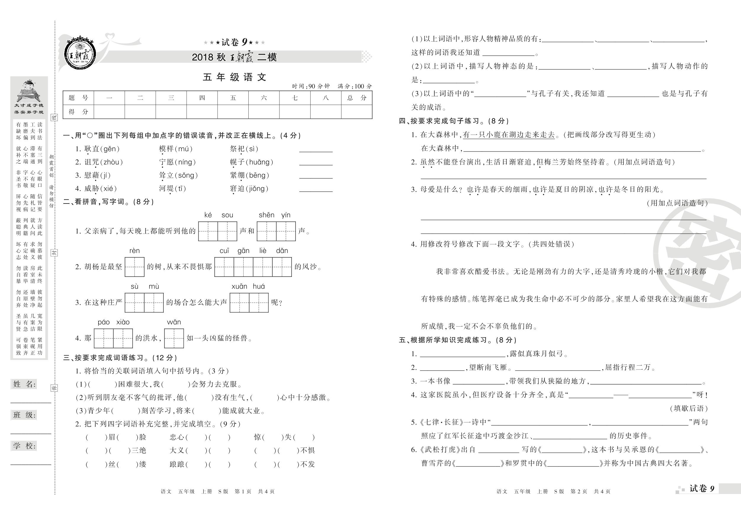 王朝霞期末模拟卷五年级上册语文(S版)_R210801222333【9】