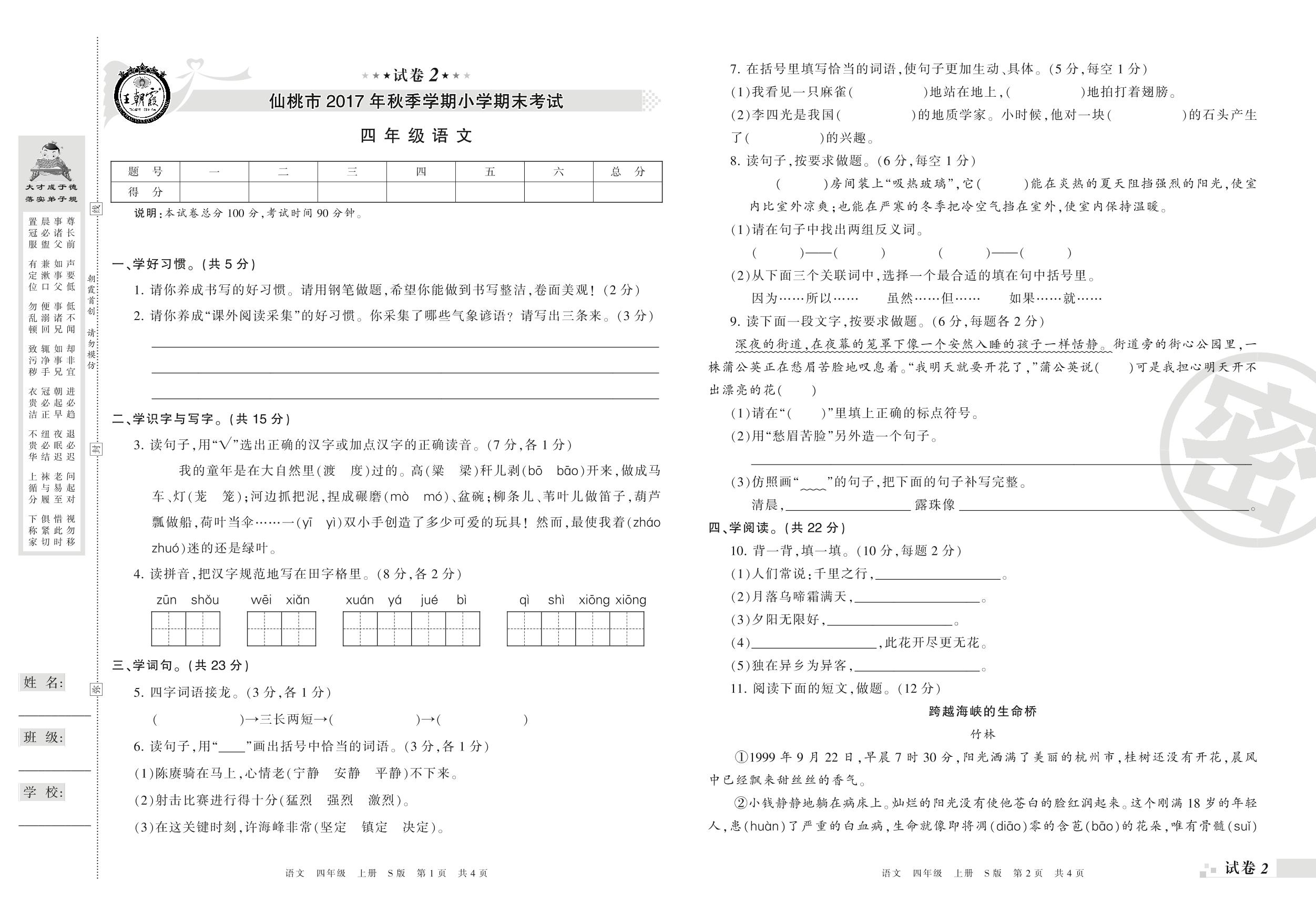 2017-2018学年第一学期仙桃市四年级语文试卷(S版)【2】