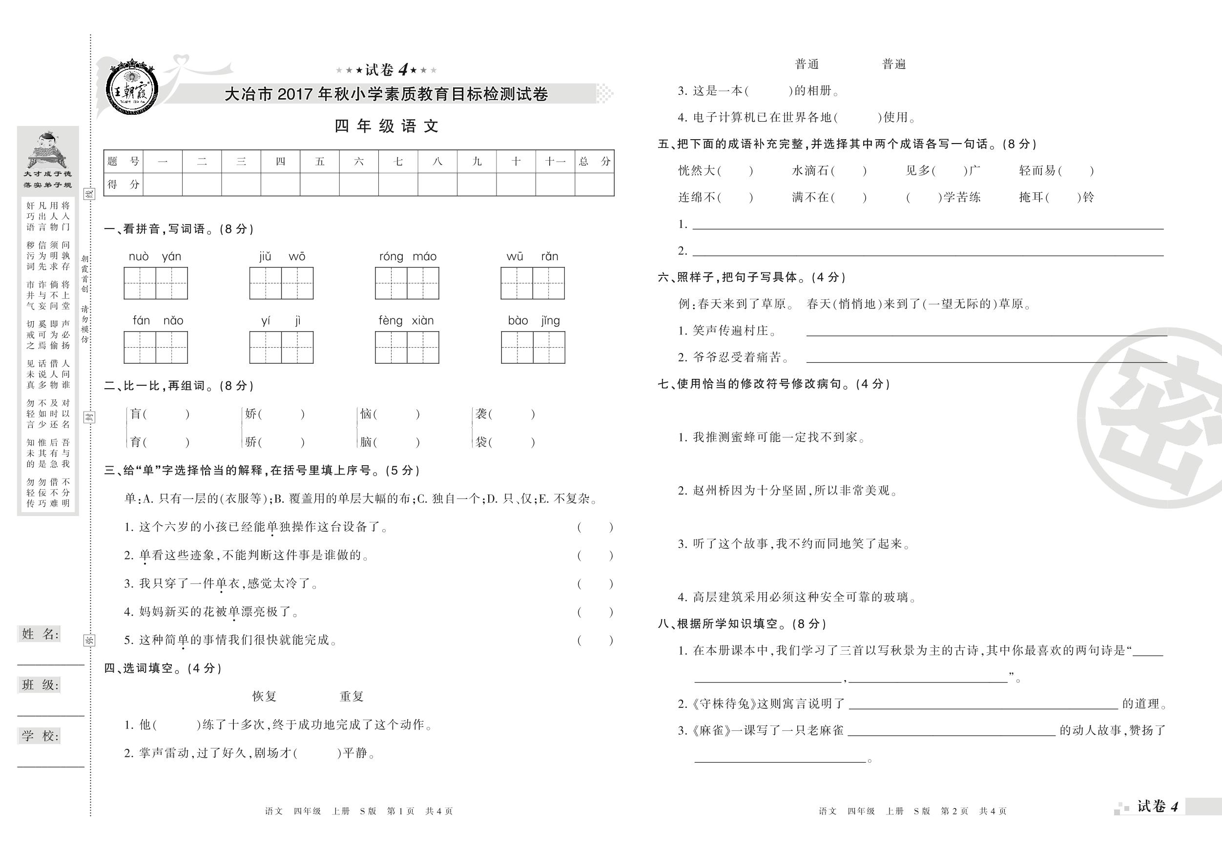 2017-2018学年第一学期大冶市四年级语文试卷(S版)【4】