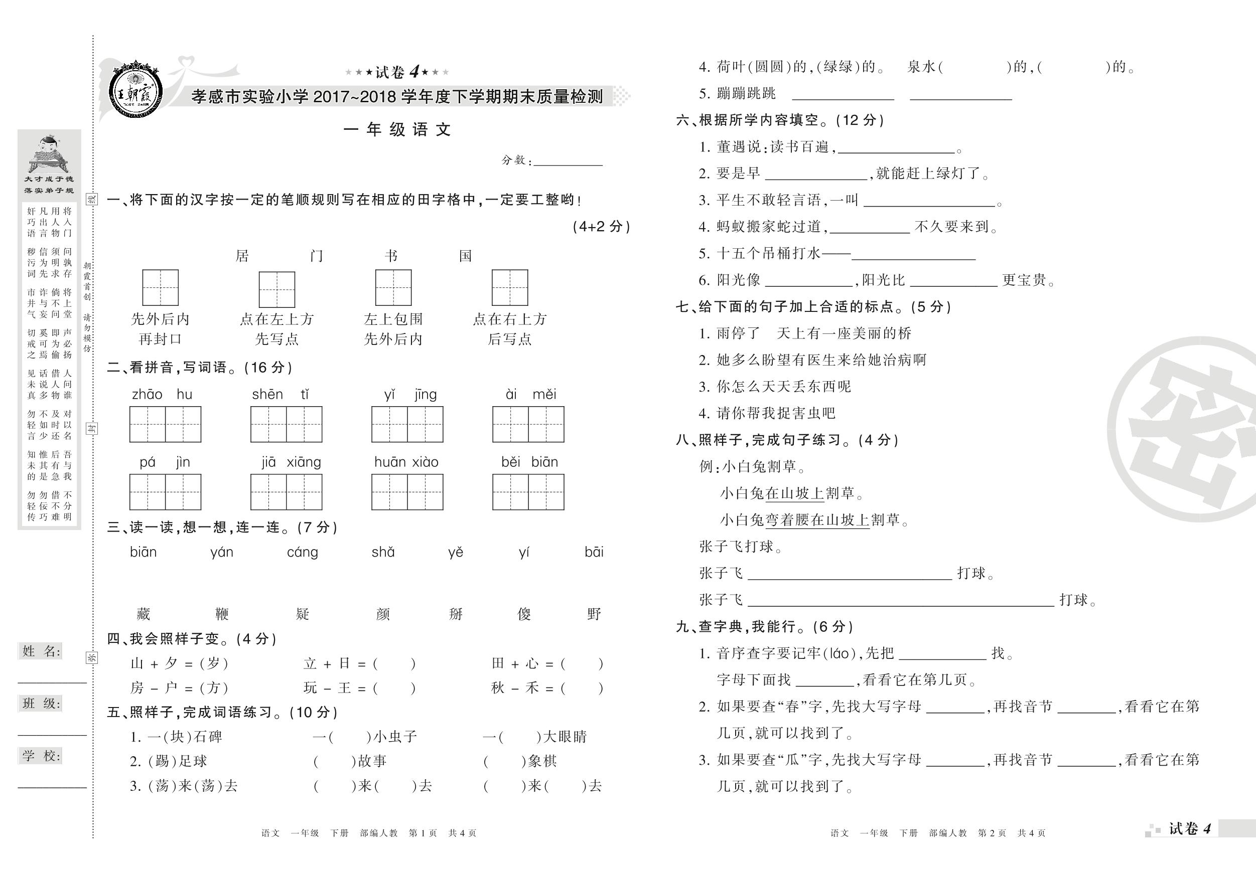 2017-2018学年第二学期孝感市实验小学一年级语文试卷(人教版)【4】