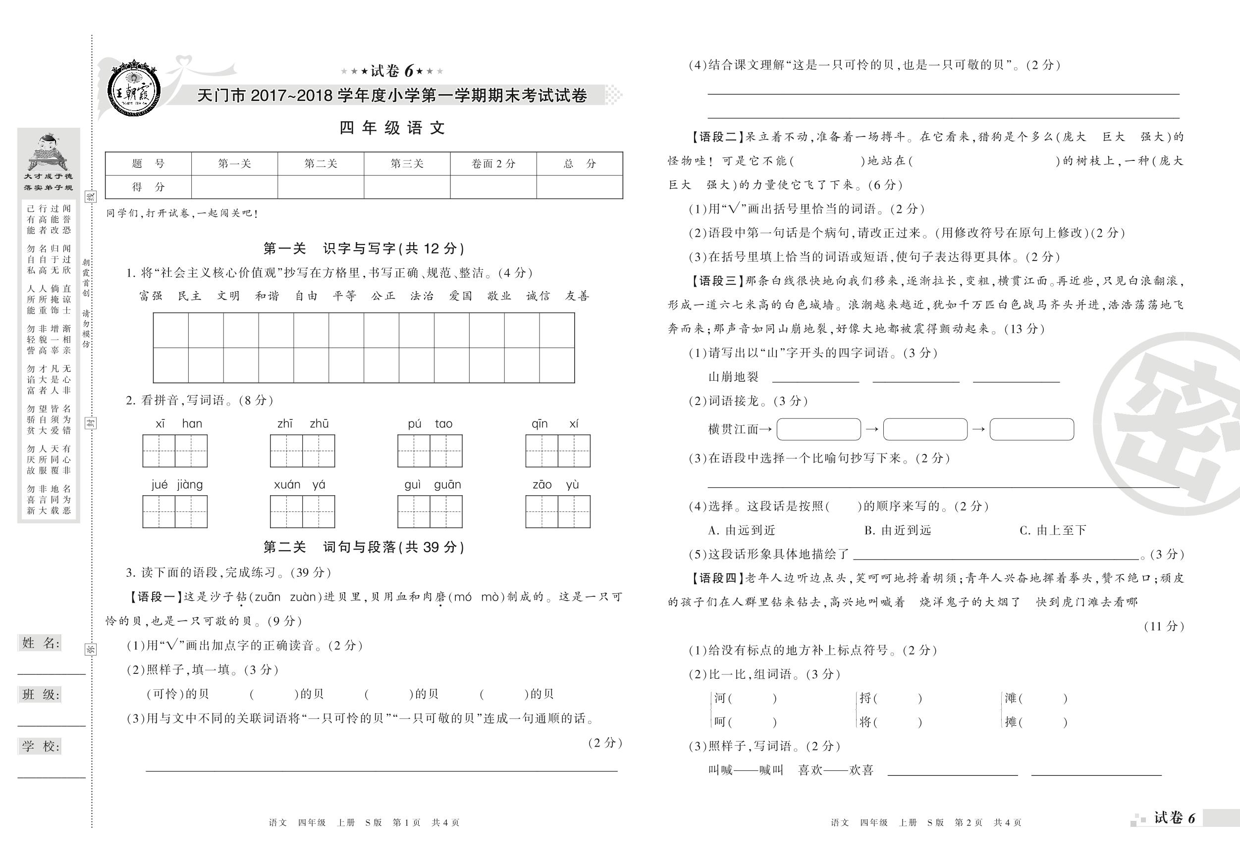 2017-2018学年第一学期天门市四年级语文试卷(S版)【6】