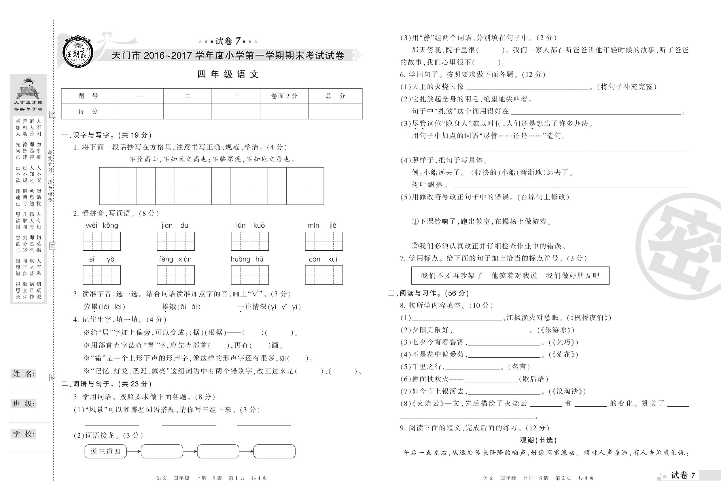 2016-2017学年第一学期天门市四年级语文试卷(S版)【7】