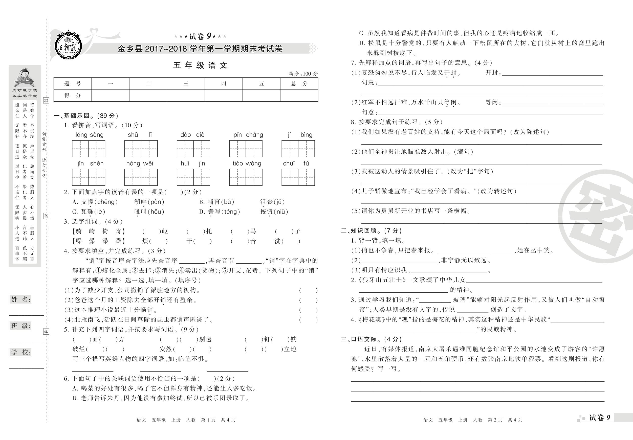 2017-2018学年第一学期济宁市金乡县五年级语文试卷(人教版)【9】