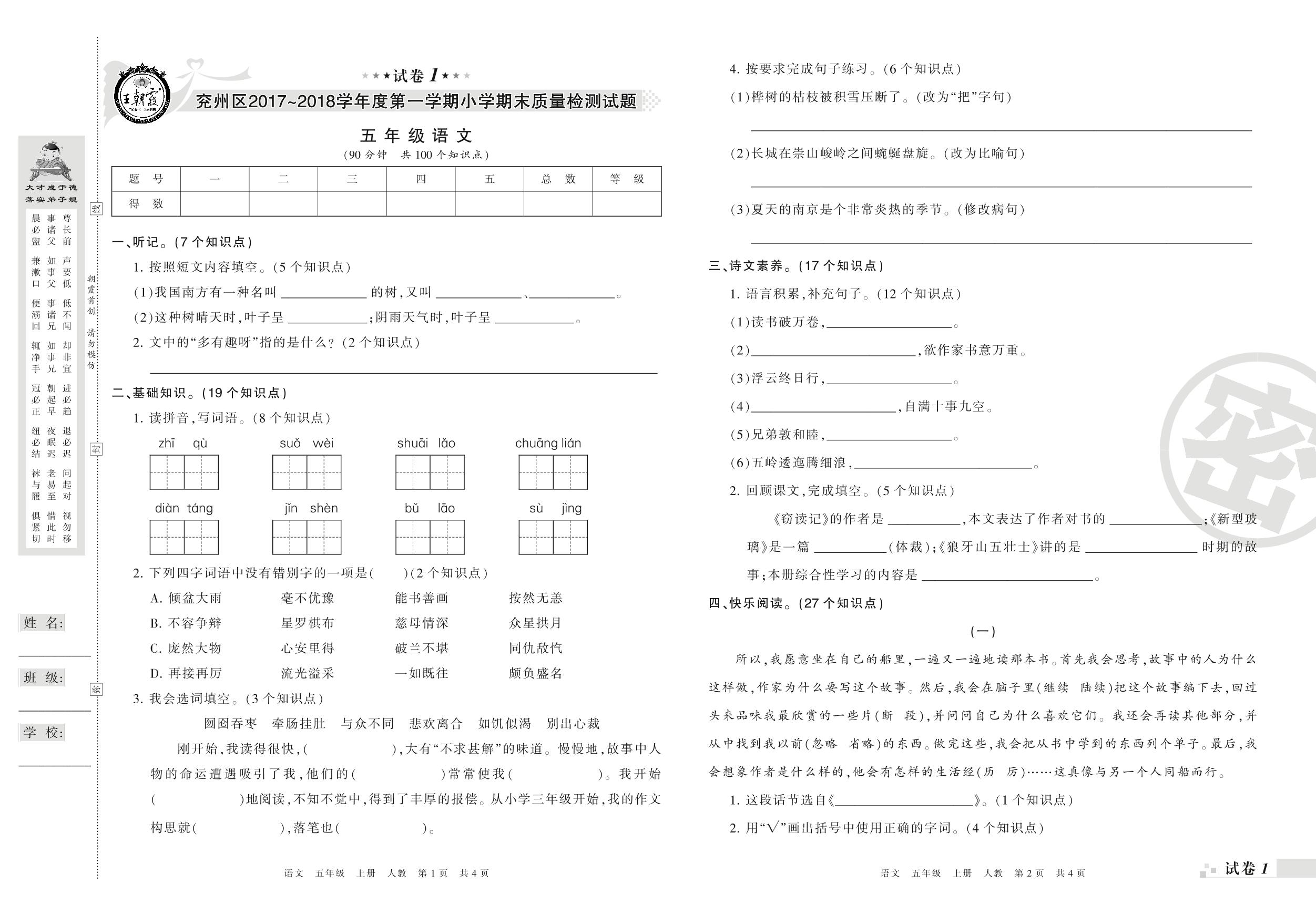 2017-2018学年第一学期济宁市兖州区五年级语文试卷(人教版)【1】