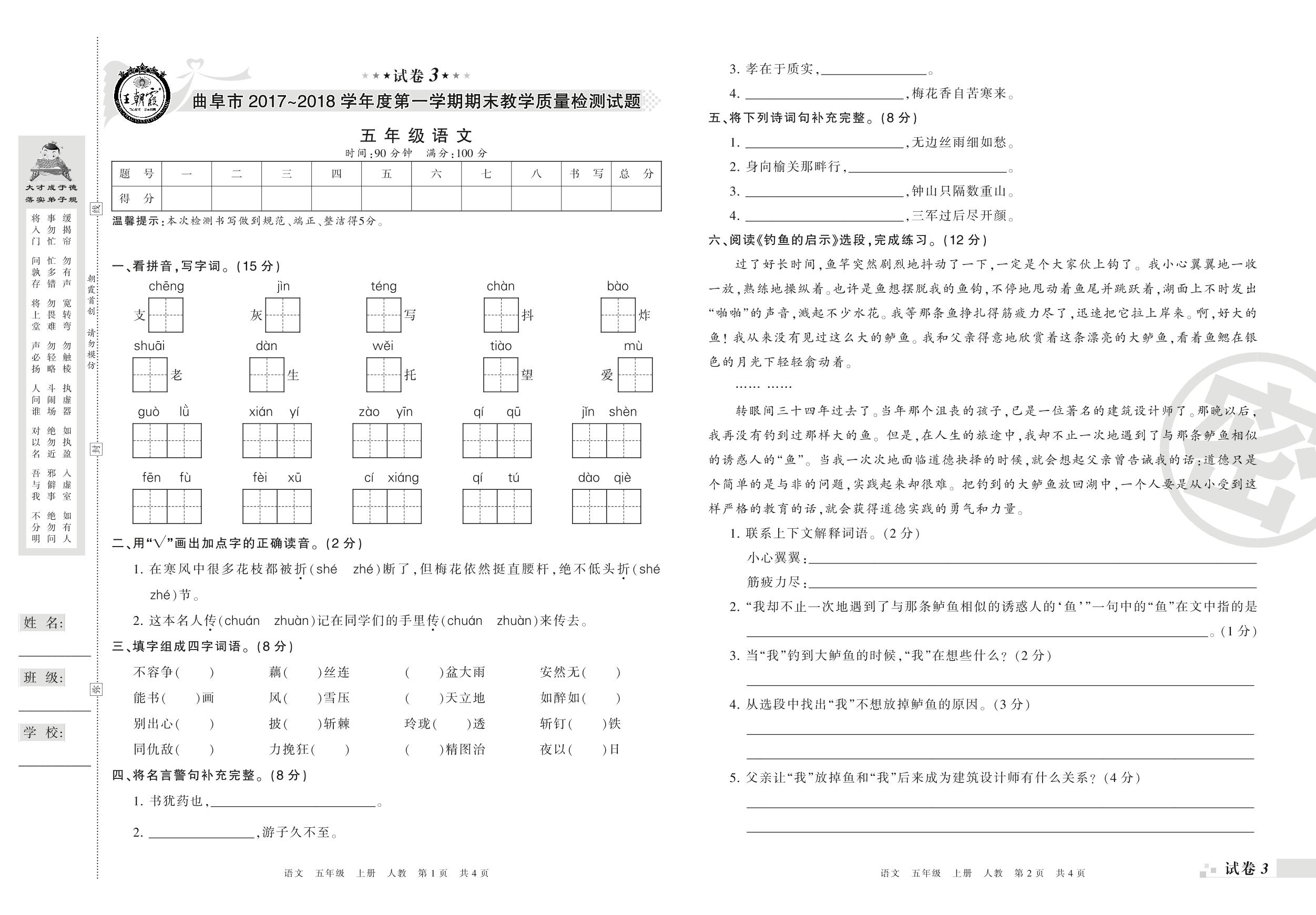 2017-2018学年第一学期曲阜市五年级语文试卷(人教版)【3】