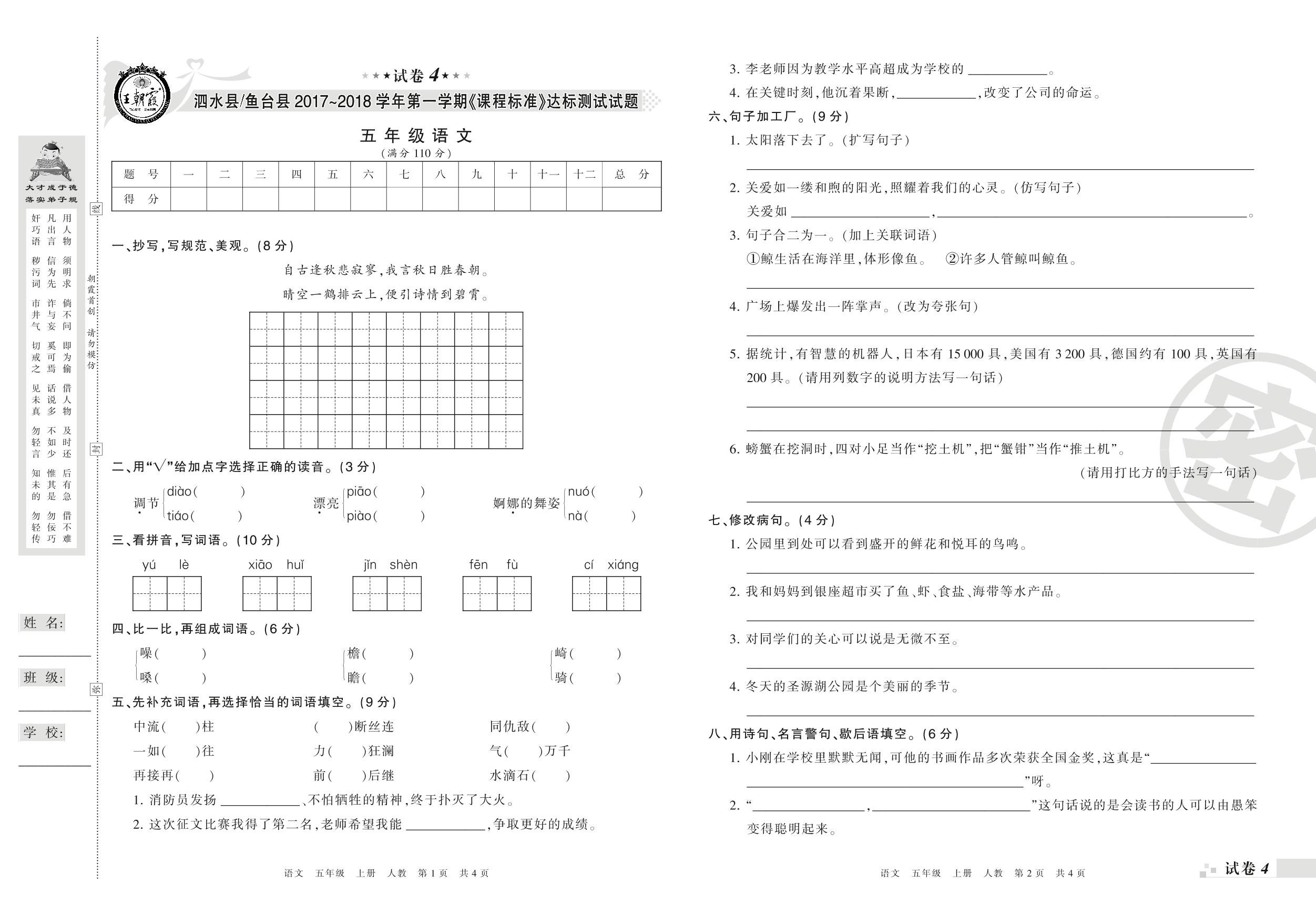 2017-2018学年第一学期济宁市泗水县(鱼台县)五年级语文试卷(人教版)【4】