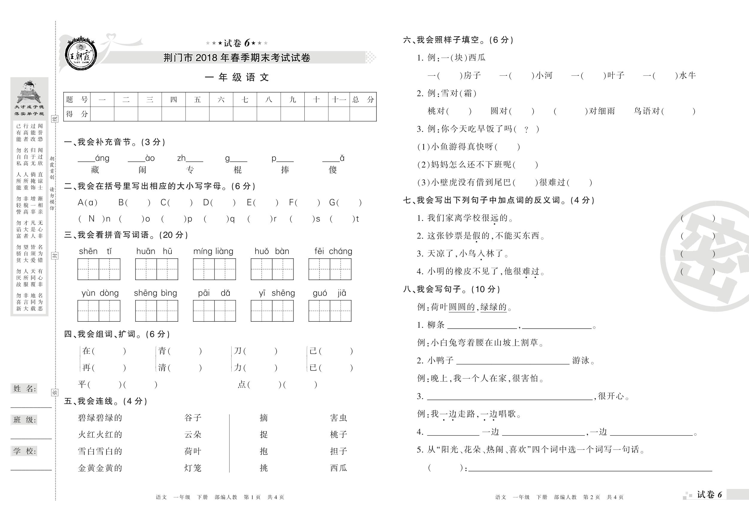 2017-2018学年第二学期荆门市一年级语文试卷(人教版)【6】