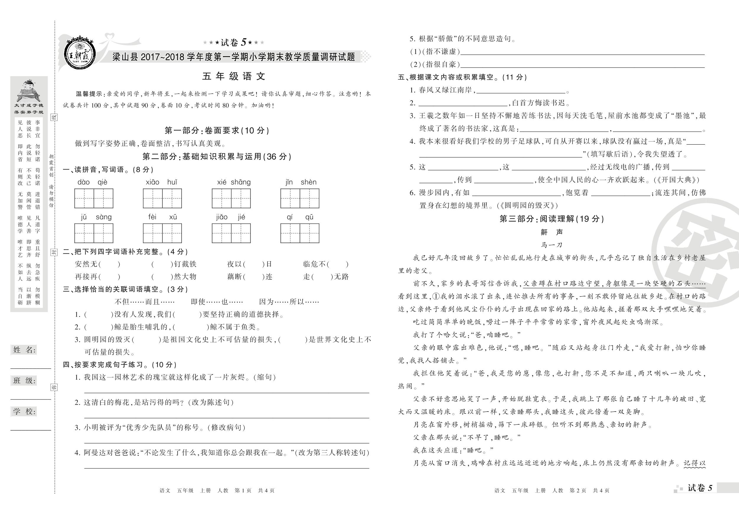 2017-2018学年第一学期济宁市梁山县五年级语文试卷(人教版)【5】