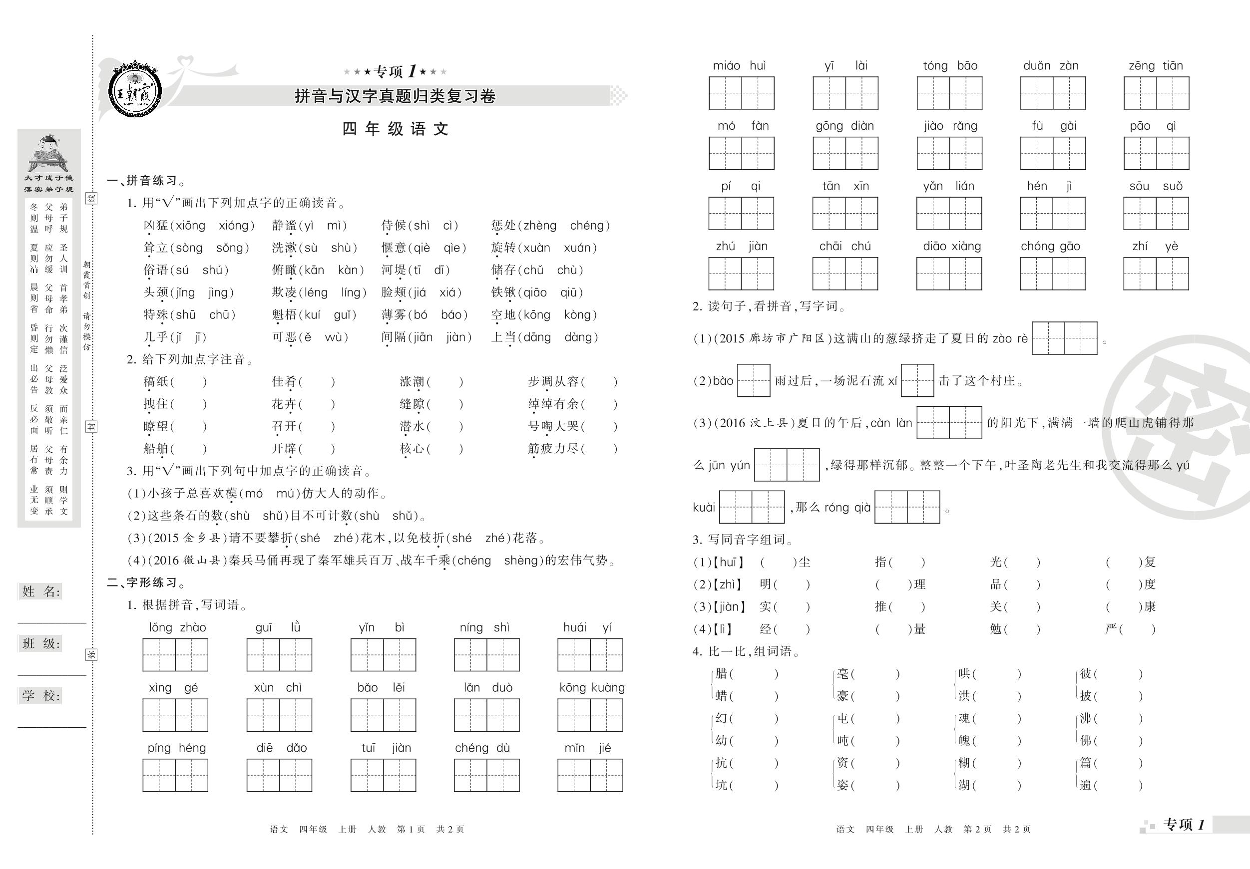 王朝霞期末专项卷——拼音与汉字、词语真题归类复习四年级上册语文(人教版)_R210801222506【0】