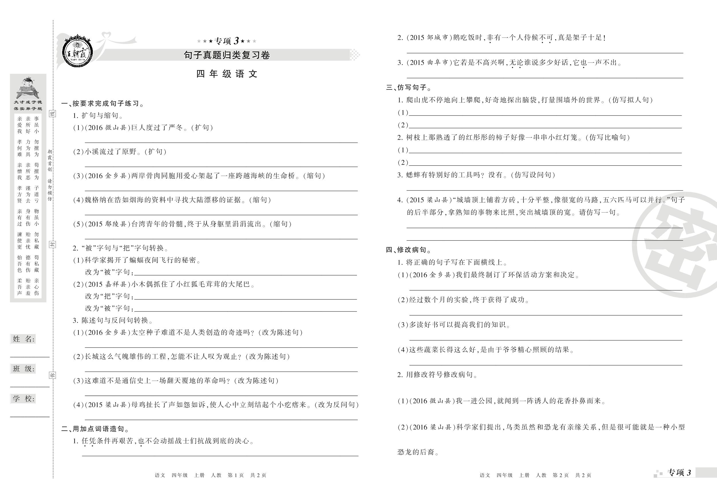 王朝霞期末专项卷——句子、课文内容真题归类复习四年级上册语文(人教版)_R210801222508【0】