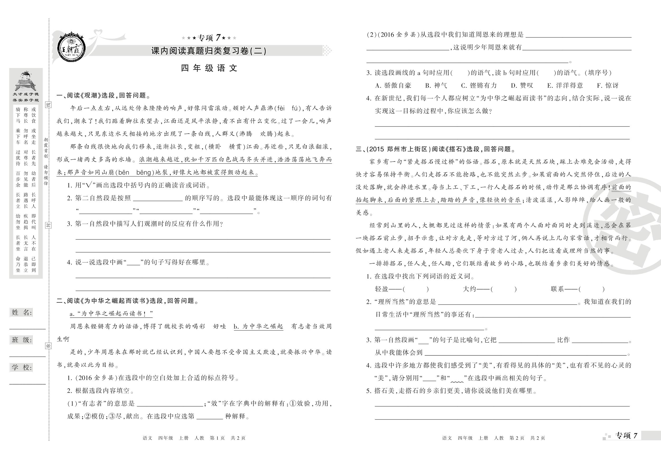 王朝霞期末专项卷——课内阅读、课外阅读与写作真题归类复习四年级上册语文(人教版)_R210801222514【0】