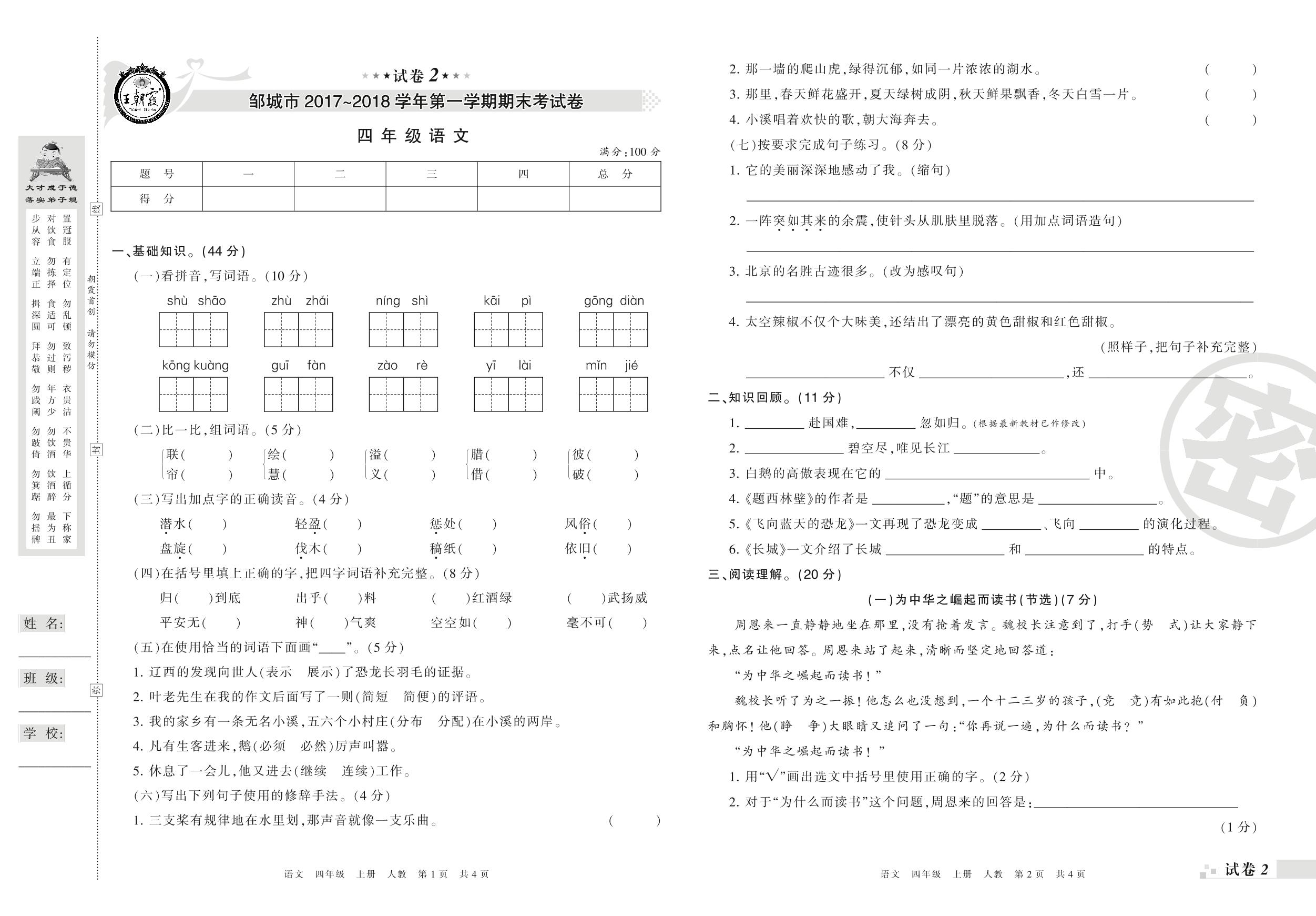 2017-2018学年第一学期邹城市四年级语文试卷(人教版)【2】