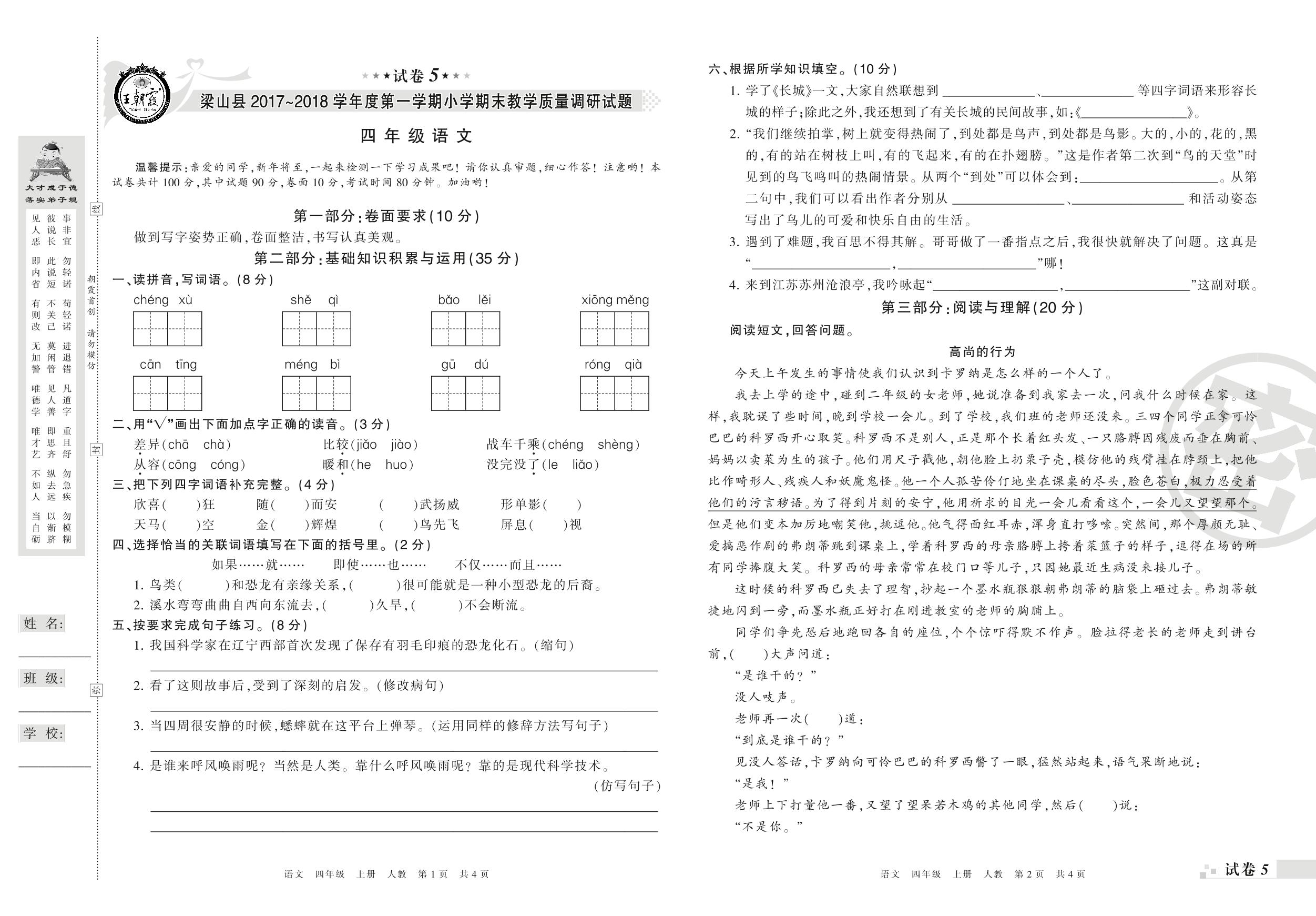 2017-2018学年第一学期济宁市梁山县四年级语文试卷(人教版)【5】
