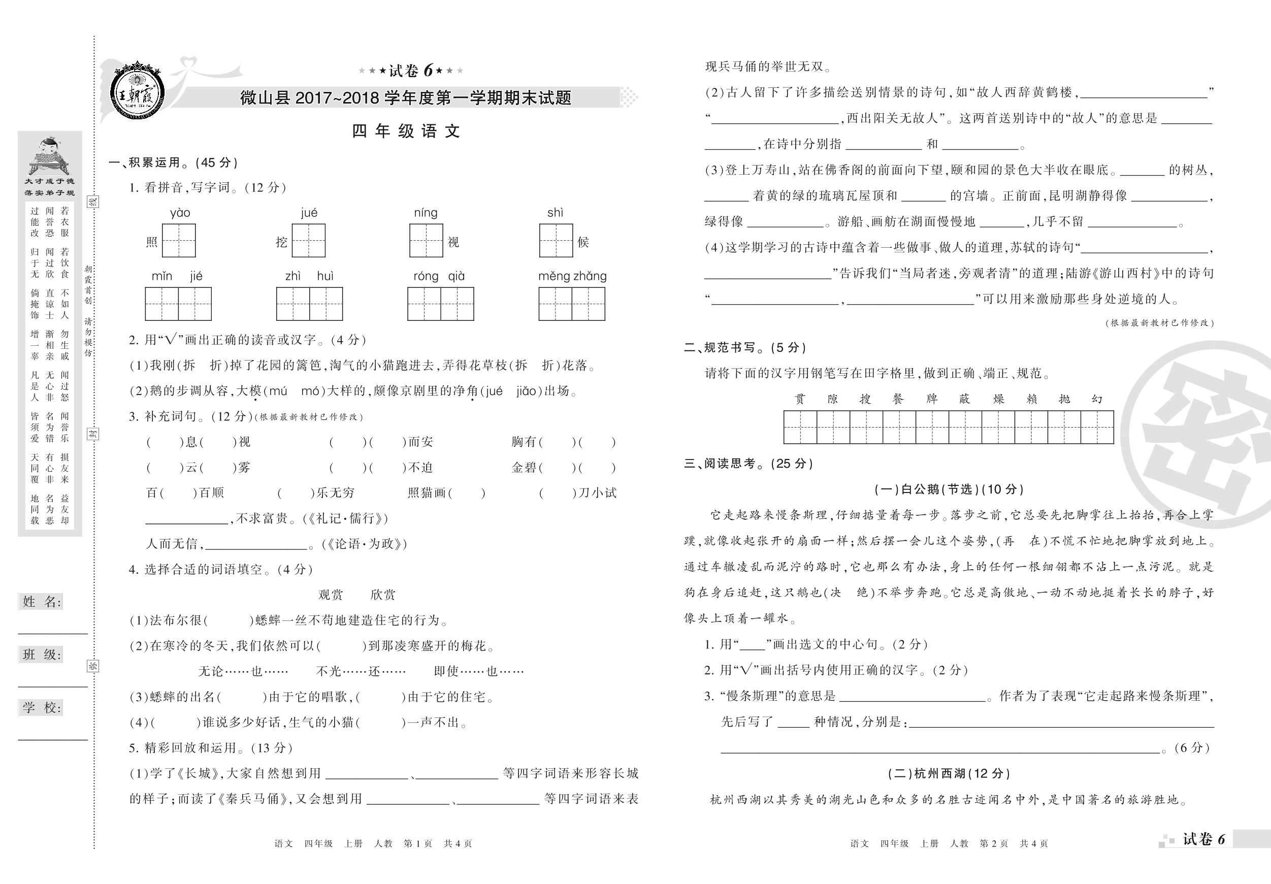 2017-2018学年第一学期济宁市微山县四年级语文试卷(人教版)【6】