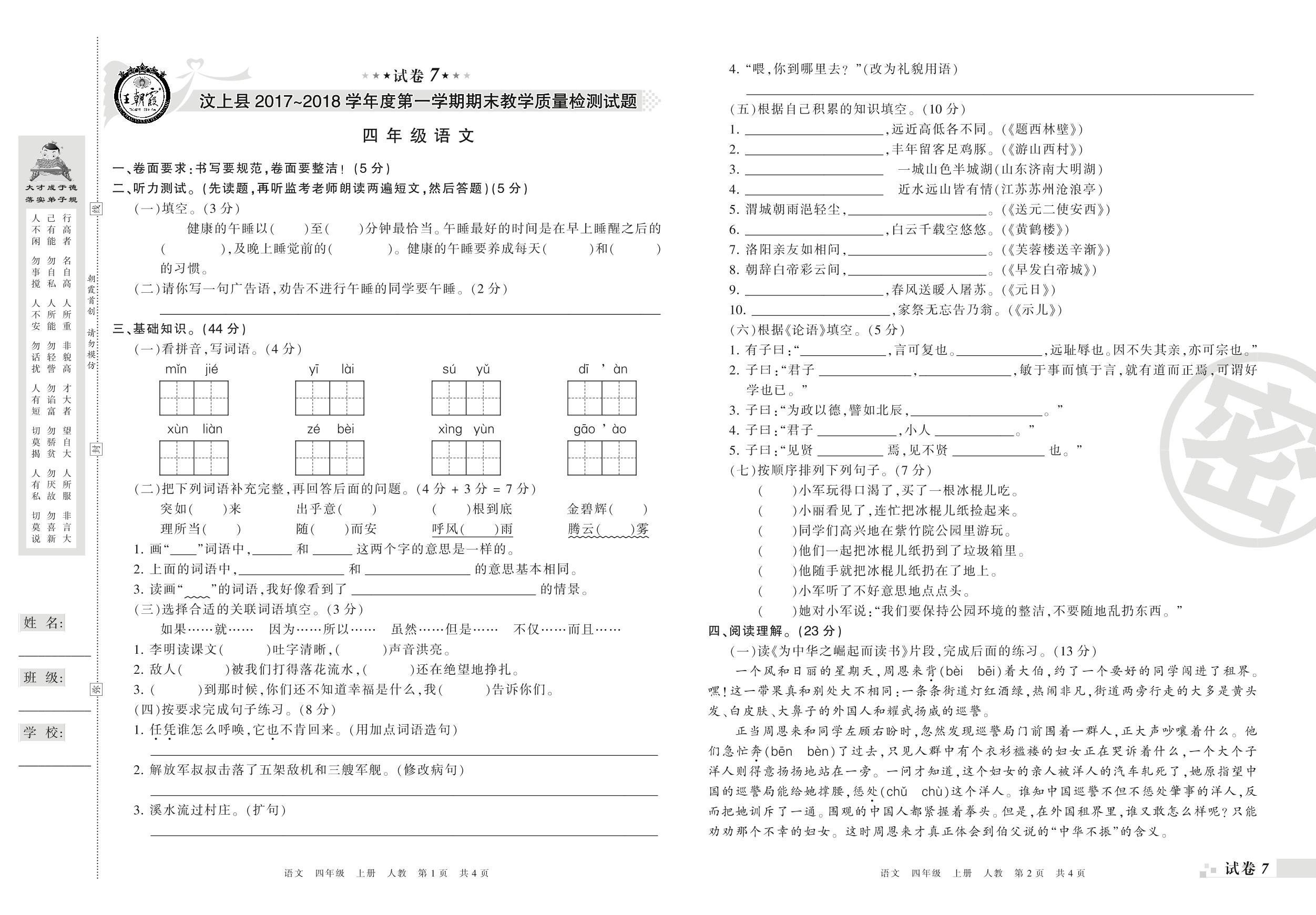 2017-2018学年第一学期济宁市汶上县四年级语文试卷(人教版)【7】
