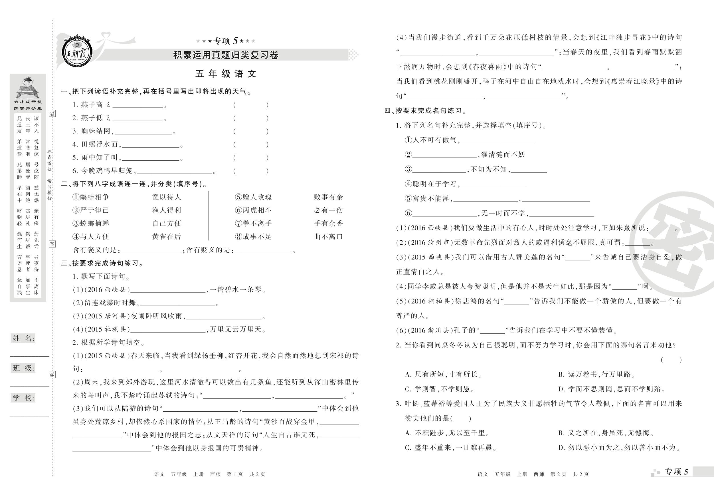 王朝霞期末专项卷——积累运用、课内阅读真题归类复习五年级上册语文(西师版)【0】