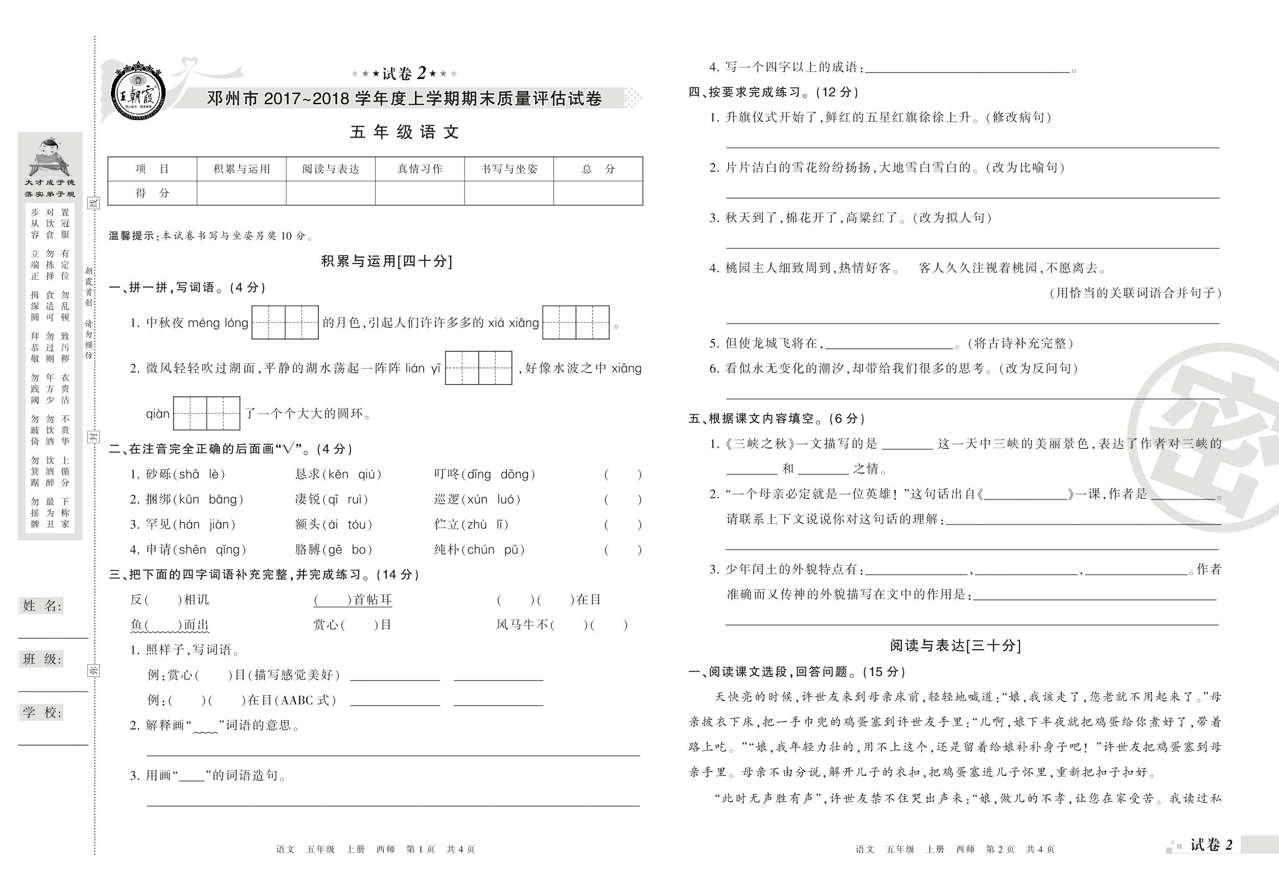 2017-2018学年第一学期邓州市五年级语文试卷(西师版)【2】