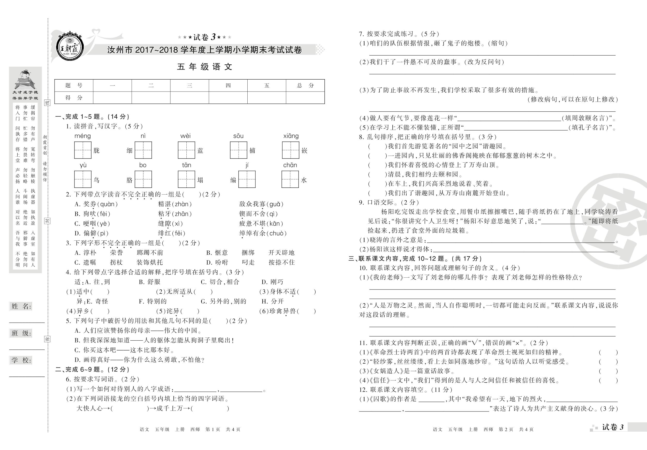 2017-2018学年第一学期汝州市五年级语文试卷(西师版)【3】