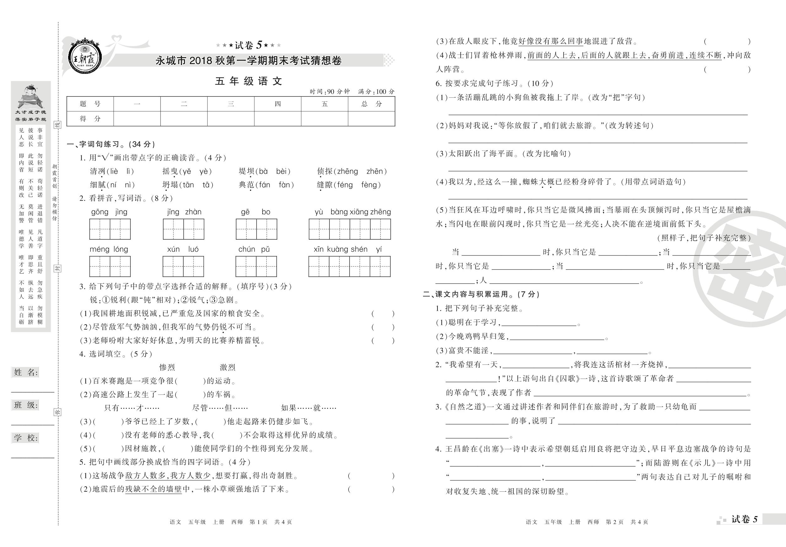 2018-2019学年第一学期永城市五年级语文试卷(西师版)【5】