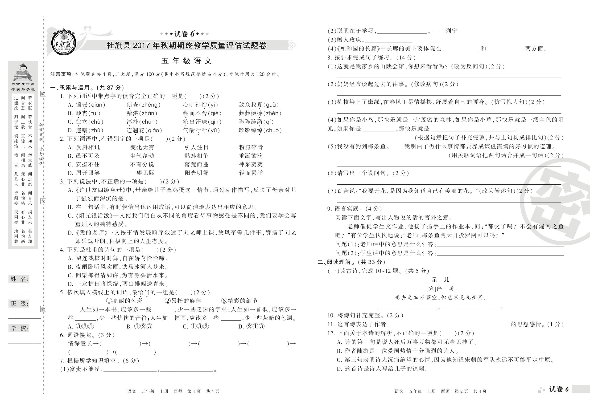 2017-2018学年第一学期南阳市社旗县五年级语文试卷(西师版)【6】